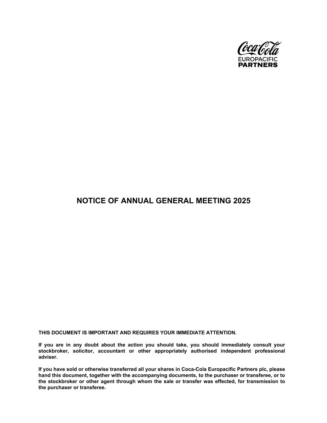 NOTICE OF ANNUAL GENERAL MEETING 2025 THIS DOCUMENT IS IMPORTANT AND REQUIRES YOUR IMMEDIATE ATTENTION. If you are in any doubt about the action you should take, you should immediately consult your stockbroker, solicitor, accountant or other appropriately authorised independent professional adviser. If you have sold or otherwise transferred all your shares in Coca-Cola Europacific Partners plc, please hand this document, together with the accompanying documents, to the purchaser or transferee, or to the stockbroker or other agent through whom the sale or transfer was effected, for transmission to the purchaser or transferee.