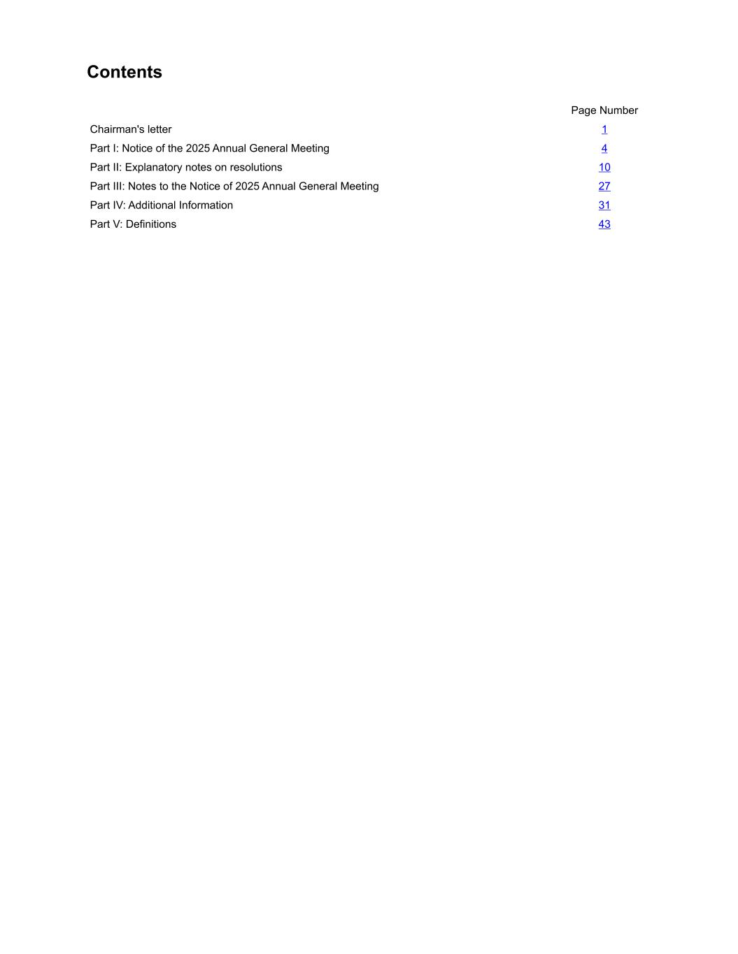 Contents Page Number Chairman's letter 1 Part I: Notice of the 2025 Annual General Meeting 4 Part II: Explanatory notes on resolutions 10 Part III: Notes to the Notice of 2025 Annual General Meeting 27 Part IV: Additional Information 31 Part V: Definitions 43