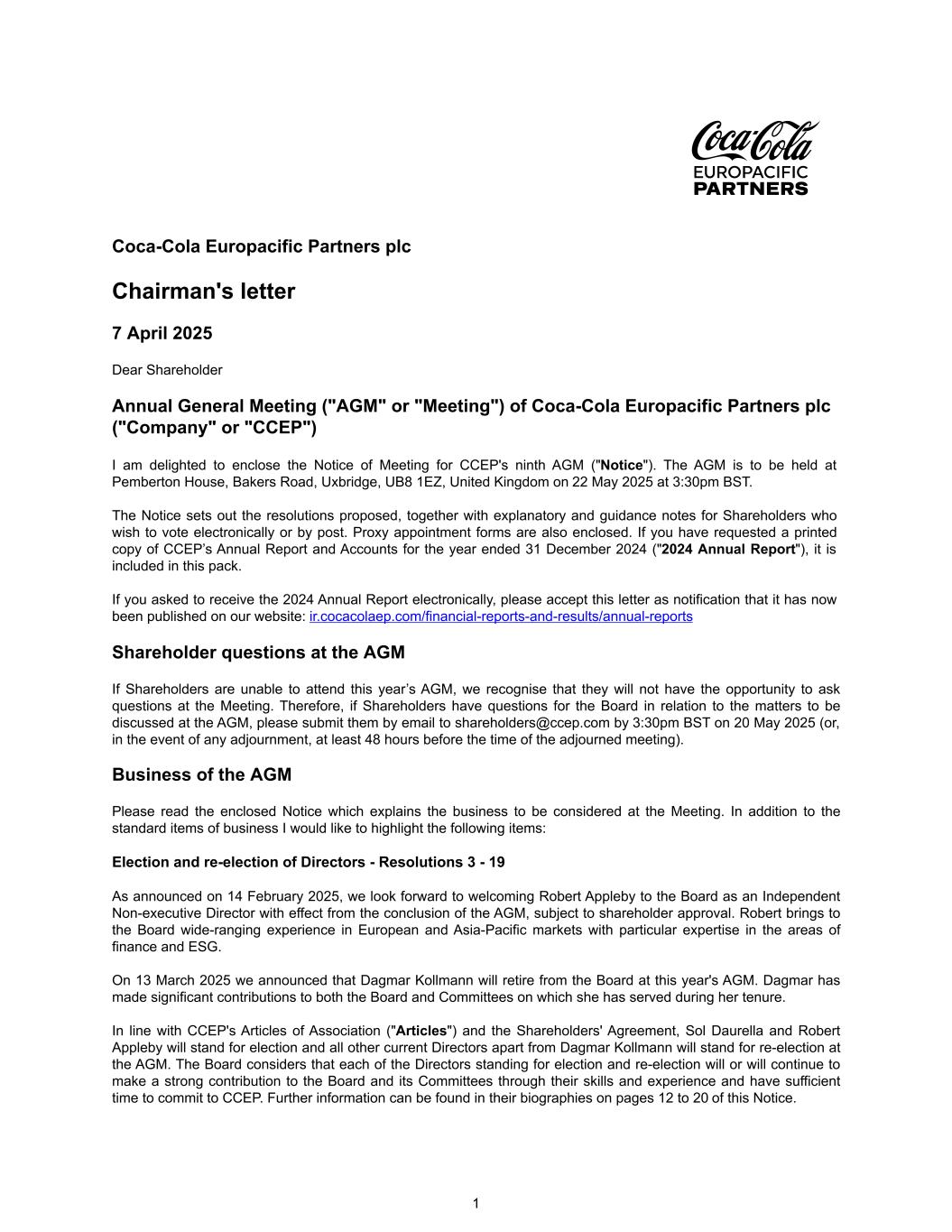 Coca-Cola Europacific Partners plc Chairman's letter 7 April 2025 Dear Shareholder Annual General Meeting ("AGM" or "Meeting") of Coca-Cola Europacific Partners plc ("Company" or "CCEP") I am delighted to enclose the Notice of Meeting for CCEP's ninth AGM ("Notice"). The AGM is to be held at Pemberton House, Bakers Road, Uxbridge, UB8 1EZ, United Kingdom on 22 May 2025 at 3:30pm BST. The Notice sets out the resolutions proposed, together with explanatory and guidance notes for Shareholders who wish to vote electronically or by post. Proxy appointment forms are also enclosed. If you have requested a printed copy of CCEP’s Annual Report and Accounts for the year ended 31 December 2024 ("2024 Annual Report"), it is included in this pack. If you asked to receive the 2024 Annual Report electronically, please accept this letter as notification that it has now been published on our website: ir.cocacolaep.com/financial-reports-and-results/annual-reports Shareholder questions at the AGM If Shareholders are unable to attend this year’s AGM, we recognise that they will not have the opportunity to ask questions at the Meeting. Therefore, if Shareholders have questions for the Board in relation to the matters to be discussed at the AGM, please submit them by email to shareholders@ccep.com by 3:30pm BST on 20 May 2025 (or, in the event of any adjournment, at least 48 hours before the time of the adjourned meeting). Business of the AGM Please read the enclosed Notice which explains the business to be considered at the Meeting. In addition to the standard items of business I would like to highlight the following items: Election and re-election of Directors - Resolutions 3 - 19 As announced on 14 February 2025, we look forward to welcoming Robert Appleby to the Board as an Independent Non-executive Director with effect from the conclusion of the AGM, subject to shareholder approval. Robert brings to the Board wide-ranging experience in European and Asia-Pacific markets with particular expertise in the areas of finance and ESG. On 13 March 2025 we announced that Dagmar Kollmann will retire from the Board at this year's AGM. Dagmar has made significant contributions to both the Board and Committees on which she has served during her tenure. In line with CCEP's Articles of Association ("Articles") and the Shareholders' Agreement, Sol Daurella and Robert Appleby will stand for election and all other current Directors apart from Dagmar Kollmann will stand for re-election at the AGM. The Board considers that each of the Directors standing for election and re-election will or will continue to make a strong contribution to the Board and its Committees through their skills and experience and have sufficient time to commit to CCEP. Further information can be found in their biographies on pages 12 to 20 of this Notice. 1