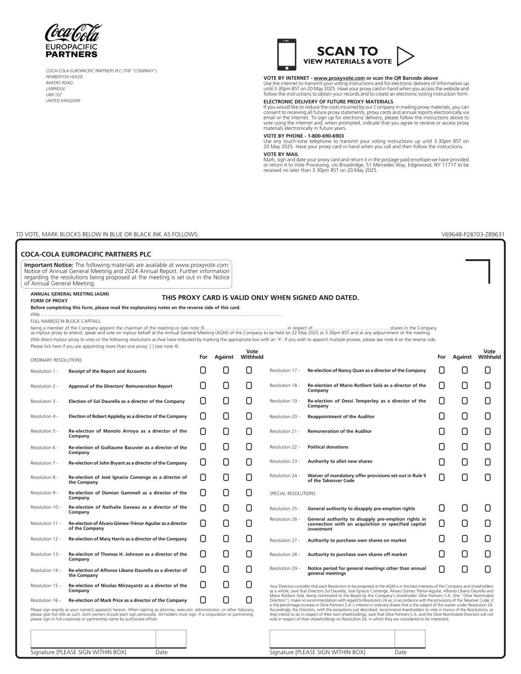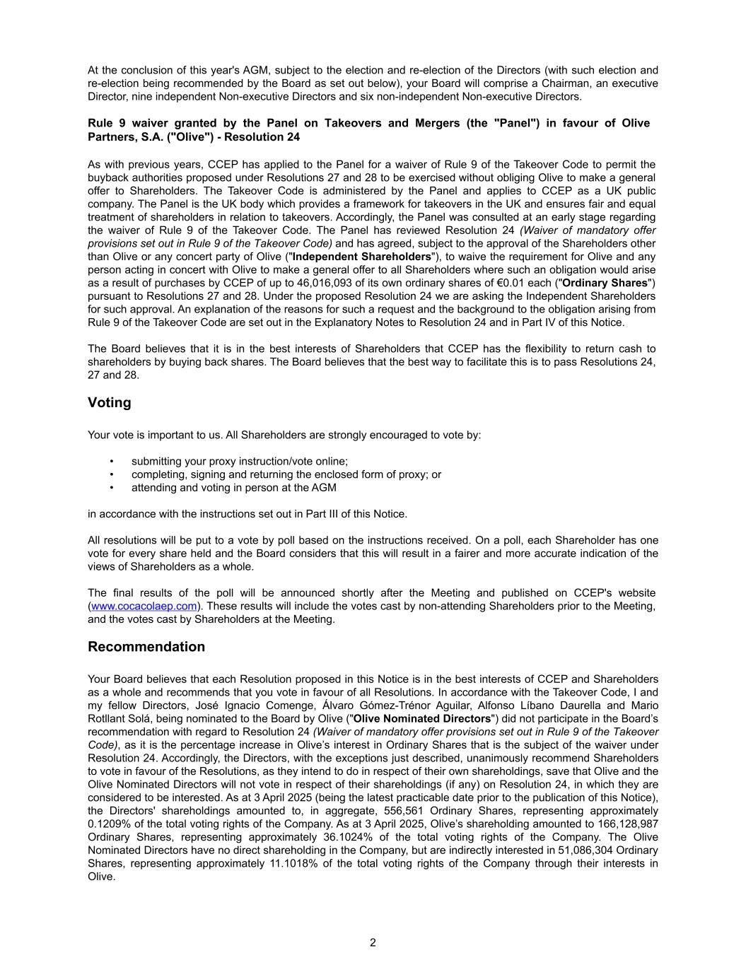 At the conclusion of this year's AGM, subject to the election and re-election of the Directors (with such election and re-election being recommended by the Board as set out below), your Board will comprise a Chairman, an executive Director, nine independent Non-executive Directors and six non-independent Non-executive Directors. Rule 9 waiver granted by the Panel on Takeovers and Mergers (the "Panel") in favour of Olive Partners, S.A. ("Olive") - Resolution 24 As with previous years, CCEP has applied to the Panel for a waiver of Rule 9 of the Takeover Code to permit the buyback authorities proposed under Resolutions 27 and 28 to be exercised without obliging Olive to make a general offer to Shareholders. The Takeover Code is administered by the Panel and applies to CCEP as a UK public company. The Panel is the UK body which provides a framework for takeovers in the UK and ensures fair and equal treatment of shareholders in relation to takeovers. Accordingly, the Panel was consulted at an early stage regarding the waiver of Rule 9 of the Takeover Code. The Panel has reviewed Resolution 24 (Waiver of mandatory offer provisions set out in Rule 9 of the Takeover Code) and has agreed, subject to the approval of the Shareholders other than Olive or any concert party of Olive ("Independent Shareholders"), to waive the requirement for Olive and any person acting in concert with Olive to make a general offer to all Shareholders where such an obligation would arise as a result of purchases by CCEP of up to 46,016,093 of its own ordinary shares of €0.01 each ("Ordinary Shares") pursuant to Resolutions 27 and 28. Under the proposed Resolution 24 we are asking the Independent Shareholders for such approval. An explanation of the reasons for such a request and the background to the obligation arising from Rule 9 of the Takeover Code are set out in the Explanatory Notes to Resolution 24 and in Part IV of this Notice. The Board believes that it is in the best interests of Shareholders that CCEP has the flexibility to return cash to shareholders by buying back shares. The Board believes that the best way to facilitate this is to pass Resolutions 24, 27 and 28. Voting Your vote is important to us. All Shareholders are strongly encouraged to vote by: • submitting your proxy instruction/vote online; • completing, signing and returning the enclosed form of proxy; or • attending and voting in person at the AGM in accordance with the instructions set out in Part III of this Notice. All resolutions will be put to a vote by poll based on the instructions received. On a poll, each Shareholder has one vote for every share held and the Board considers that this will result in a fairer and more accurate indication of the views of Shareholders as a whole. The final results of the poll will be announced shortly after the Meeting and published on CCEP's website (www.cocacolaep.com). These results will include the votes cast by non-attending Shareholders prior to the Meeting, and the votes cast by Shareholders at the Meeting. Recommendation Your Board believes that each Resolution proposed in this Notice is in the best interests of CCEP and Shareholders as a whole and recommends that you vote in favour of all Resolutions. In accordance with the Takeover Code, I and my fellow Directors, José Ignacio Comenge, Álvaro Gómez-Trénor Aguilar, Alfonso Líbano Daurella and Mario Rotllant Solá, being nominated to the Board by Olive ("Olive Nominated Directors") did not participate in the Board’s recommendation with regard to Resolution 24 (Waiver of mandatory offer provisions set out in Rule 9 of the Takeover Code), as it is the percentage increase in Olive’s interest in Ordinary Shares that is the subject of the waiver under Resolution 24. Accordingly, the Directors, with the exceptions just described, unanimously recommend Shareholders to vote in favour of the Resolutions, as they intend to do in respect of their own shareholdings, save that Olive and the Olive Nominated Directors will not vote in respect of their shareholdings (if any) on Resolution 24, in which they are considered to be interested. As at 3 April 2025 (being the latest practicable date prior to the publication of this Notice), the Directors' shareholdings amounted to, in aggregate, 556,561 Ordinary Shares, representing approximately 0.1209% of the total voting rights of the Company. As at 3 April 2025, Olive’s shareholding amounted to 166,128,987 Ordinary Shares, representing approximately 36.1024% of the total voting rights of the Company. The Olive Nominated Directors have no direct shareholding in the Company, but are indirectly interested in 51,086,304 Ordinary Shares, representing approximately 11.1018% of the total voting rights of the Company through their interests in Olive. 2