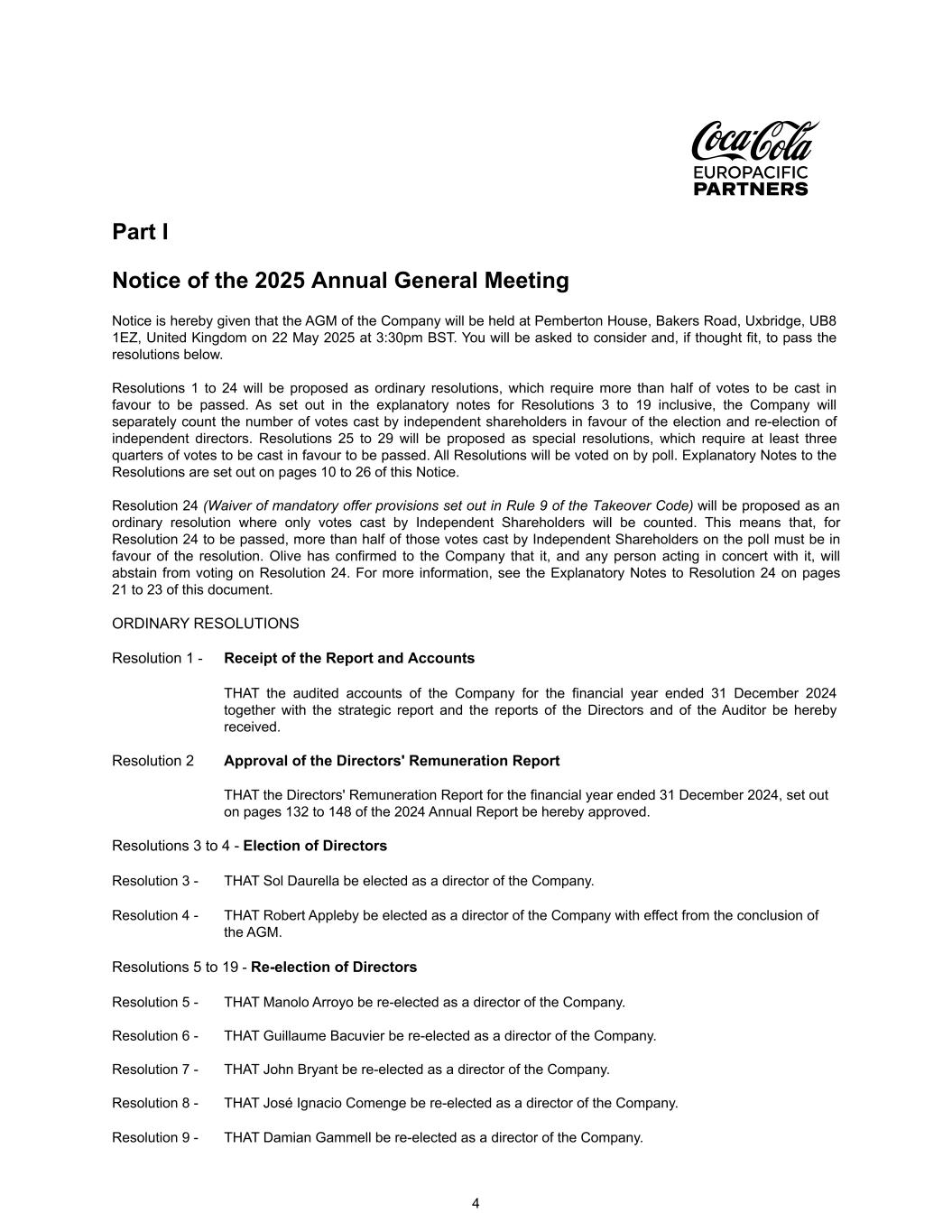 Part I Notice of the 2025 Annual General Meeting Notice is hereby given that the AGM of the Company will be held at Pemberton House, Bakers Road, Uxbridge, UB8 1EZ, United Kingdom on 22 May 2025 at 3:30pm BST. You will be asked to consider and, if thought fit, to pass the resolutions below. Resolutions 1 to 24 will be proposed as ordinary resolutions, which require more than half of votes to be cast in favour to be passed. As set out in the explanatory notes for Resolutions 3 to 19 inclusive, the Company will separately count the number of votes cast by independent shareholders in favour of the election and re-election of independent directors. Resolutions 25 to 29 will be proposed as special resolutions, which require at least three quarters of votes to be cast in favour to be passed. All Resolutions will be voted on by poll. Explanatory Notes to the Resolutions are set out on pages 10 to 26 of this Notice. Resolution 24 (Waiver of mandatory offer provisions set out in Rule 9 of the Takeover Code) will be proposed as an ordinary resolution where only votes cast by Independent Shareholders will be counted. This means that, for Resolution 24 to be passed, more than half of those votes cast by Independent Shareholders on the poll must be in favour of the resolution. Olive has confirmed to the Company that it, and any person acting in concert with it, will abstain from voting on Resolution 24. For more information, see the Explanatory Notes to Resolution 24 on pages 21 to 23 of this document. ORDINARY RESOLUTIONS Resolution 1 - Receipt of the Report and Accounts THAT the audited accounts of the Company for the financial year ended 31 December 2024 together with the strategic report and the reports of the Directors and of the Auditor be hereby received. Resolution 2 Approval of the Directors' Remuneration Report THAT the Directors' Remuneration Report for the financial year ended 31 December 2024, set out on pages 132 to 148 of the 2024 Annual Report be hereby approved. Resolutions 3 to 4 - Election of Directors Resolution 3 - THAT Sol Daurella be elected as a director of the Company. Resolution 4 - THAT Robert Appleby be elected as a director of the Company with effect from the conclusion of the AGM. Resolutions 5 to 19 - Re-election of Directors Resolution 5 - THAT Manolo Arroyo be re-elected as a director of the Company. Resolution 6 - THAT Guillaume Bacuvier be re-elected as a director of the Company. Resolution 7 - THAT John Bryant be re-elected as a director of the Company. Resolution 8 - THAT José Ignacio Comenge be re-elected as a director of the Company. Resolution 9 - THAT Damian Gammell be re-elected as a director of the Company. 4