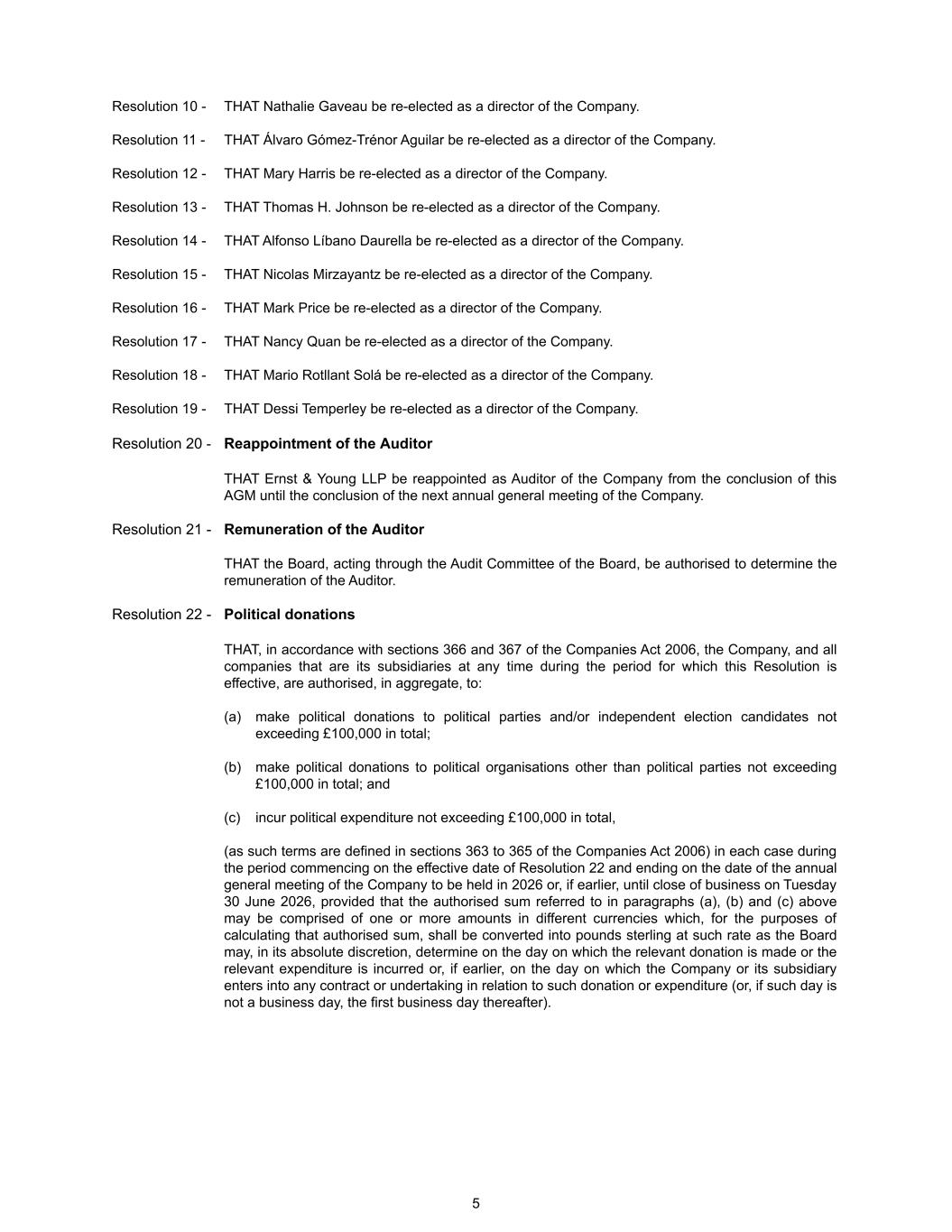 Resolution 10 - THAT Nathalie Gaveau be re-elected as a director of the Company. Resolution 11 - THAT Álvaro Gómez-Trénor Aguilar be re-elected as a director of the Company. Resolution 12 - THAT Mary Harris be re-elected as a director of the Company. Resolution 13 - THAT Thomas H. Johnson be re-elected as a director of the Company. Resolution 14 - THAT Alfonso Líbano Daurella be re-elected as a director of the Company. Resolution 15 - THAT Nicolas Mirzayantz be re-elected as a director of the Company. Resolution 16 - THAT Mark Price be re-elected as a director of the Company. Resolution 17 - THAT Nancy Quan be re-elected as a director of the Company. Resolution 18 - THAT Mario Rotllant Solá be re-elected as a director of the Company. Resolution 19 - THAT Dessi Temperley be re-elected as a director of the Company. Resolution 20 - Reappointment of the Auditor THAT Ernst & Young LLP be reappointed as Auditor of the Company from the conclusion of this AGM until the conclusion of the next annual general meeting of the Company. Resolution 21 - Remuneration of the Auditor THAT the Board, acting through the Audit Committee of the Board, be authorised to determine the remuneration of the Auditor. Resolution 22 - Political donations THAT, in accordance with sections 366 and 367 of the Companies Act 2006, the Company, and all companies that are its subsidiaries at any time during the period for which this Resolution is effective, are authorised, in aggregate, to: (a) make political donations to political parties and/or independent election candidates not exceeding £100,000 in total; (b) make political donations to political organisations other than political parties not exceeding £100,000 in total; and (c) incur political expenditure not exceeding £100,000 in total, (as such terms are defined in sections 363 to 365 of the Companies Act 2006) in each case during the period commencing on the effective date of Resolution 22 and ending on the date of the annual general meeting of the Company to be held in 2026 or, if earlier, until close of business on Tuesday 30 June 2026, provided that the authorised sum referred to in paragraphs (a), (b) and (c) above may be comprised of one or more amounts in different currencies which, for the purposes of calculating that authorised sum, shall be converted into pounds sterling at such rate as the Board may, in its absolute discretion, determine on the day on which the relevant donation is made or the relevant expenditure is incurred or, if earlier, on the day on which the Company or its subsidiary enters into any contract or undertaking in relation to such donation or expenditure (or, if such day is not a business day, the first business day thereafter). 5