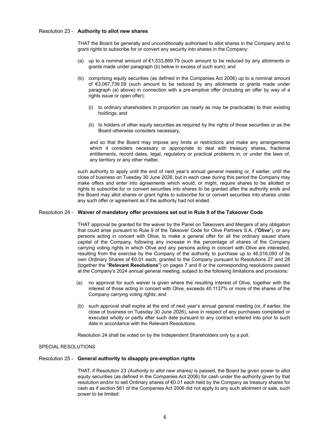 Resolution 23 - Authority to allot new shares THAT the Board be generally and unconditionally authorised to allot shares in the Company and to grant rights to subscribe for or convert any security into shares in the Company: (a) up to a nominal amount of €1,533,869.79 (such amount to be reduced by any allotments or grants made under paragraph (b) below in excess of such sum); and (b) comprising equity securities (as defined in the Companies Act 2006) up to a nominal amount of €3,067,739.59 (such amount to be reduced by any allotments or grants made under paragraph (a) above) in connection with a pre-emptive offer (including an offer by way of a rights issue or open offer): (i) to ordinary shareholders in proportion (as nearly as may be practicable) to their existing holdings; and (ii) to holders of other equity securities as required by the rights of those securities or as the Board otherwise considers necessary, and so that the Board may impose any limits or restrictions and make any arrangements which it considers necessary or appropriate to deal with treasury shares, fractional entitlements, record dates, legal, regulatory or practical problems in, or under the laws of, any territory or any other matter, such authority to apply until the end of next year’s annual general meeting or, if earlier, until the close of business on Tuesday 30 June 2026, but in each case during this period the Company may make offers and enter into agreements which would, or might, require shares to be allotted or rights to subscribe for or convert securities into shares to be granted after the authority ends and the Board may allot shares or grant rights to subscribe for or convert securities into shares under any such offer or agreement as if the authority had not ended. Resolution 24 - Waiver of mandatory offer provisions set out in Rule 9 of the Takeover Code THAT approval be granted for the waiver by the Panel on Takeovers and Mergers of any obligation that could arise pursuant to Rule 9 of the Takeover Code for Olive Partners S.A. ("Olive"), or any persons acting in concert with Olive, to make a general offer for all the ordinary issued share capital of the Company, following any increase in the percentage of shares of the Company carrying voting rights in which Olive and any persons acting in concert with Olive are interested, resulting from the exercise by the Company of the authority to purchase up to 46,016,093 of its own Ordinary Shares of €0.01 each, granted to the Company pursuant to Resolutions 27 and 28 (together the "Relevant Resolutions") on pages 7 and 8 or the corresponding resolutions passed at the Company's 2024 annual general meeting, subject to the following limitations and provisions: (a) no approval for such waiver is given where the resulting interest of Olive, together with the interest of those acting in concert with Olive, exceeds 40.1137% or more of the shares of the Company carrying voting rights; and (b) such approval shall expire at the end of next year’s annual general meeting (or, if earlier, the close of business on Tuesday 30 June 2026), save in respect of any purchases completed or executed wholly or partly after such date pursuant to any contract entered into prior to such date in accordance with the Relevant Resolutions. Resolution 24 shall be voted on by the Independent Shareholders only by a poll. SPECIAL RESOLUTIONS Resolution 25 - General authority to disapply pre-emption rights THAT, if Resolution 23 (Authority to allot new shares) is passed, the Board be given power to allot equity securities (as defined in the Companies Act 2006) for cash under the authority given by that resolution and/or to sell Ordinary shares of €0.01 each held by the Company as treasury shares for cash as if section 561 of the Companies Act 2006 did not apply to any such allotment or sale, such power to be limited: 6