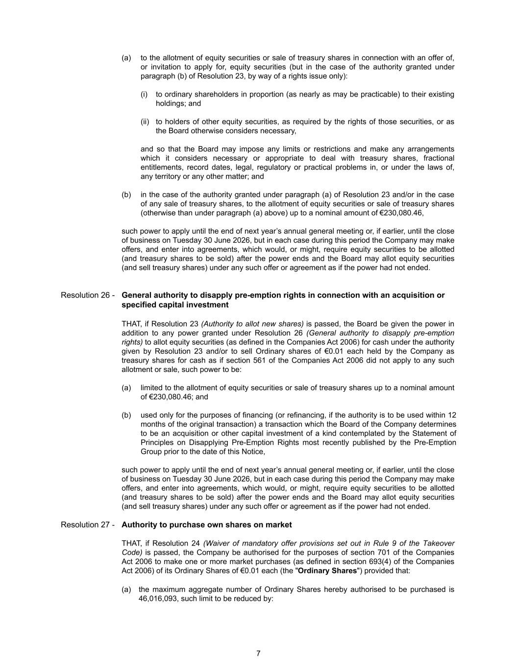 (a) to the allotment of equity securities or sale of treasury shares in connection with an offer of, or invitation to apply for, equity securities (but in the case of the authority granted under paragraph (b) of Resolution 23, by way of a rights issue only): (i) to ordinary shareholders in proportion (as nearly as may be practicable) to their existing holdings; and (ii) to holders of other equity securities, as required by the rights of those securities, or as the Board otherwise considers necessary, and so that the Board may impose any limits or restrictions and make any arrangements which it considers necessary or appropriate to deal with treasury shares, fractional entitlements, record dates, legal, regulatory or practical problems in, or under the laws of, any territory or any other matter; and (b) in the case of the authority granted under paragraph (a) of Resolution 23 and/or in the case of any sale of treasury shares, to the allotment of equity securities or sale of treasury shares (otherwise than under paragraph (a) above) up to a nominal amount of €230,080.46, such power to apply until the end of next year’s annual general meeting or, if earlier, until the close of business on Tuesday 30 June 2026, but in each case during this period the Company may make offers, and enter into agreements, which would, or might, require equity securities to be allotted (and treasury shares to be sold) after the power ends and the Board may allot equity securities (and sell treasury shares) under any such offer or agreement as if the power had not ended. Resolution 26 - General authority to disapply pre-emption rights in connection with an acquisition or specified capital investment THAT, if Resolution 23 (Authority to allot new shares) is passed, the Board be given the power in addition to any power granted under Resolution 26 (General authority to disapply pre-emption rights) to allot equity securities (as defined in the Companies Act 2006) for cash under the authority given by Resolution 23 and/or to sell Ordinary shares of €0.01 each held by the Company as treasury shares for cash as if section 561 of the Companies Act 2006 did not apply to any such allotment or sale, such power to be: (a) limited to the allotment of equity securities or sale of treasury shares up to a nominal amount of €230,080.46; and (b) used only for the purposes of financing (or refinancing, if the authority is to be used within 12 months of the original transaction) a transaction which the Board of the Company determines to be an acquisition or other capital investment of a kind contemplated by the Statement of Principles on Disapplying Pre-Emption Rights most recently published by the Pre-Emption Group prior to the date of this Notice, such power to apply until the end of next year’s annual general meeting or, if earlier, until the close of business on Tuesday 30 June 2026, but in each case during this period the Company may make offers, and enter into agreements, which would, or might, require equity securities to be allotted (and treasury shares to be sold) after the power ends and the Board may allot equity securities (and sell treasury shares) under any such offer or agreement as if the power had not ended. Resolution 27 - Authority to purchase own shares on market THAT, if Resolution 24 (Waiver of mandatory offer provisions set out in Rule 9 of the Takeover Code) is passed, the Company be authorised for the purposes of section 701 of the Companies Act 2006 to make one or more market purchases (as defined in section 693(4) of the Companies Act 2006) of its Ordinary Shares of €0.01 each (the "Ordinary Shares") provided that: (a) the maximum aggregate number of Ordinary Shares hereby authorised to be purchased is 46,016,093, such limit to be reduced by: 7