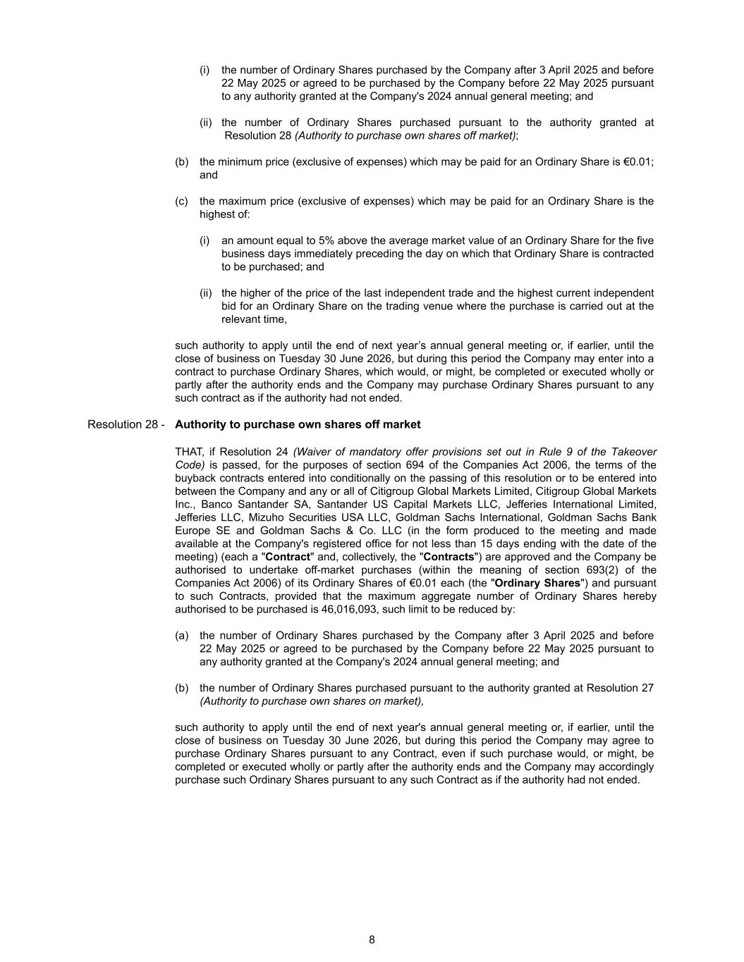 (i) the number of Ordinary Shares purchased by the Company after 3 April 2025 and before 22 May 2025 or agreed to be purchased by the Company before 22 May 2025 pursuant to any authority granted at the Company's 2024 annual general meeting; and (ii) the number of Ordinary Shares purchased pursuant to the authority granted at Resolution 28 (Authority to purchase own shares off market); (b) the minimum price (exclusive of expenses) which may be paid for an Ordinary Share is €0.01; and (c) the maximum price (exclusive of expenses) which may be paid for an Ordinary Share is the highest of: (i) an amount equal to 5% above the average market value of an Ordinary Share for the five business days immediately preceding the day on which that Ordinary Share is contracted to be purchased; and (ii) the higher of the price of the last independent trade and the highest current independent bid for an Ordinary Share on the trading venue where the purchase is carried out at the relevant time, such authority to apply until the end of next year’s annual general meeting or, if earlier, until the close of business on Tuesday 30 June 2026, but during this period the Company may enter into a contract to purchase Ordinary Shares, which would, or might, be completed or executed wholly or partly after the authority ends and the Company may purchase Ordinary Shares pursuant to any such contract as if the authority had not ended. Resolution 28 - Authority to purchase own shares off market THAT, if Resolution 24 (Waiver of mandatory offer provisions set out in Rule 9 of the Takeover Code) is passed, for the purposes of section 694 of the Companies Act 2006, the terms of the buyback contracts entered into conditionally on the passing of this resolution or to be entered into between the Company and any or all of Citigroup Global Markets Limited, Citigroup Global Markets Inc., Banco Santander SA, Santander US Capital Markets LLC, Jefferies International Limited, Jefferies LLC, Mizuho Securities USA LLC, Goldman Sachs International, Goldman Sachs Bank Europe SE and Goldman Sachs & Co. LLC (in the form produced to the meeting and made available at the Company's registered office for not less than 15 days ending with the date of the meeting) (each a "Contract" and, collectively, the "Contracts") are approved and the Company be authorised to undertake off-market purchases (within the meaning of section 693(2) of the Companies Act 2006) of its Ordinary Shares of €0.01 each (the "Ordinary Shares") and pursuant to such Contracts, provided that the maximum aggregate number of Ordinary Shares hereby authorised to be purchased is 46,016,093, such limit to be reduced by: (a) the number of Ordinary Shares purchased by the Company after 3 April 2025 and before 22 May 2025 or agreed to be purchased by the Company before 22 May 2025 pursuant to any authority granted at the Company's 2024 annual general meeting; and (b) the number of Ordinary Shares purchased pursuant to the authority granted at Resolution 27 (Authority to purchase own shares on market), such authority to apply until the end of next year's annual general meeting or, if earlier, until the close of business on Tuesday 30 June 2026, but during this period the Company may agree to purchase Ordinary Shares pursuant to any Contract, even if such purchase would, or might, be completed or executed wholly or partly after the authority ends and the Company may accordingly purchase such Ordinary Shares pursuant to any such Contract as if the authority had not ended. 8