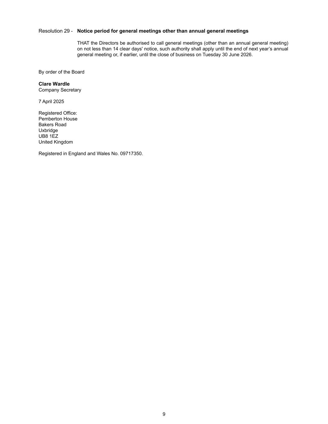 Resolution 29 - Notice period for general meetings other than annual general meetings THAT the Directors be authorised to call general meetings (other than an annual general meeting) on not less than 14 clear days' notice, such authority shall apply until the end of next year’s annual general meeting or, if earlier, until the close of business on Tuesday 30 June 2026. By order of the Board Clare Wardle Company Secretary 7 April 2025 Registered Office: Pemberton House Bakers Road Uxbridge UB8 1EZ United Kingdom Registered in England and Wales No. 09717350. 9