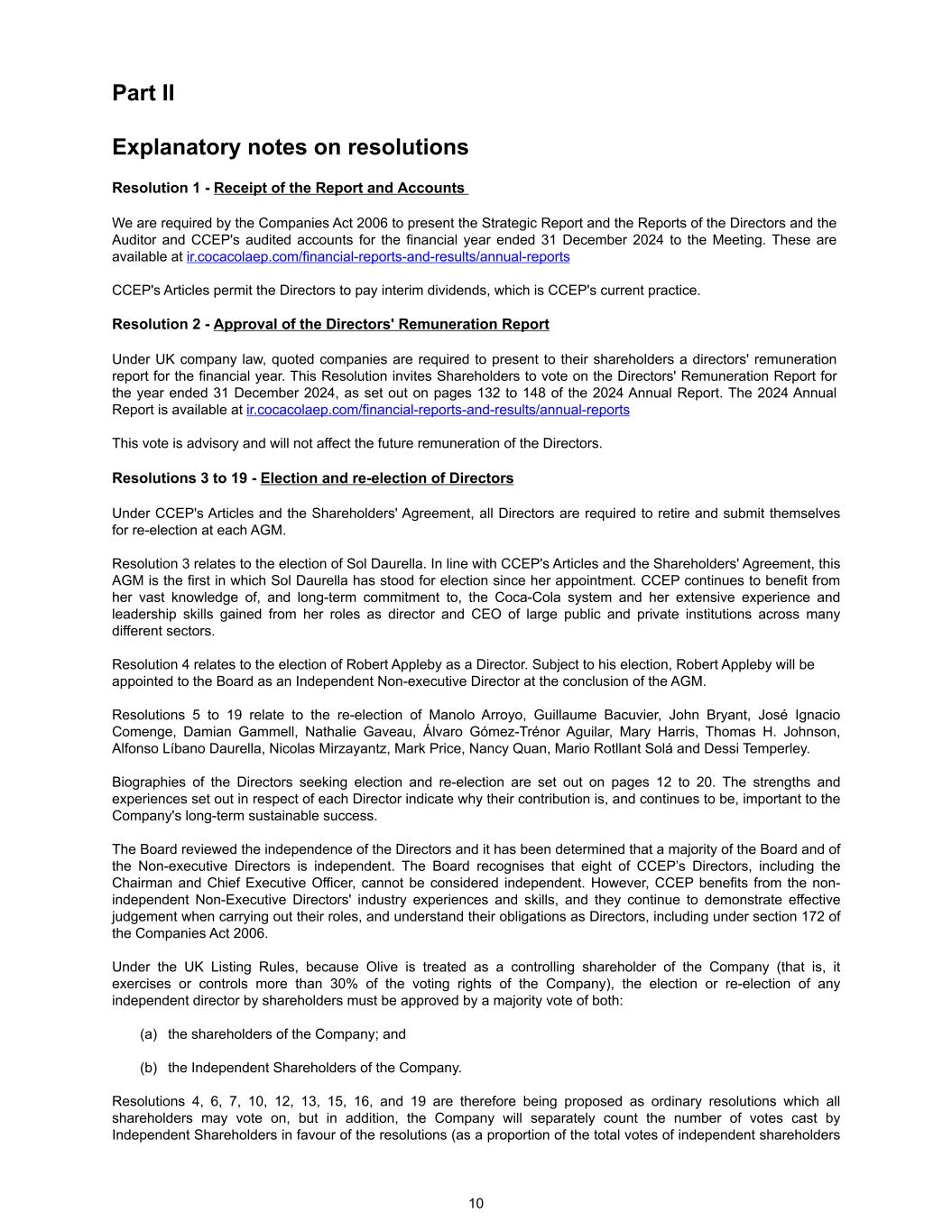 Part II Explanatory notes on resolutions Resolution 1 - Receipt of the Report and Accounts We are required by the Companies Act 2006 to present the Strategic Report and the Reports of the Directors and the Auditor and CCEP's audited accounts for the financial year ended 31 December 2024 to the Meeting. These are available at ir.cocacolaep.com/financial-reports-and-results/annual-reports CCEP's Articles permit the Directors to pay interim dividends, which is CCEP's current practice. Resolution 2 - Approval of the Directors' Remuneration Report Under UK company law, quoted companies are required to present to their shareholders a directors' remuneration report for the financial year. This Resolution invites Shareholders to vote on the Directors' Remuneration Report for the year ended 31 December 2024, as set out on pages 132 to 148 of the 2024 Annual Report. The 2024 Annual Report is available at ir.cocacolaep.com/financial-reports-and-results/annual-reports This vote is advisory and will not affect the future remuneration of the Directors. Resolutions 3 to 19 - Election and re-election of Directors Under CCEP's Articles and the Shareholders' Agreement, all Directors are required to retire and submit themselves for re-election at each AGM. Resolution 3 relates to the election of Sol Daurella. In line with CCEP's Articles and the Shareholders' Agreement, this AGM is the first in which Sol Daurella has stood for election since her appointment. CCEP continues to benefit from her vast knowledge of, and long-term commitment to, the Coca-Cola system and her extensive experience and leadership skills gained from her roles as director and CEO of large public and private institutions across many different sectors. Resolution 4 relates to the election of Robert Appleby as a Director. Subject to his election, Robert Appleby will be appointed to the Board as an Independent Non-executive Director at the conclusion of the AGM. Resolutions 5 to 19 relate to the re-election of Manolo Arroyo, Guillaume Bacuvier, John Bryant, José Ignacio Comenge, Damian Gammell, Nathalie Gaveau, Álvaro Gómez-Trénor Aguilar, Mary Harris, Thomas H. Johnson, Alfonso Líbano Daurella, Nicolas Mirzayantz, Mark Price, Nancy Quan, Mario Rotllant Solá and Dessi Temperley. Biographies of the Directors seeking election and re-election are set out on pages 12 to 20. The strengths and experiences set out in respect of each Director indicate why their contribution is, and continues to be, important to the Company's long-term sustainable success. The Board reviewed the independence of the Directors and it has been determined that a majority of the Board and of the Non-executive Directors is independent. The Board recognises that eight of CCEP’s Directors, including the Chairman and Chief Executive Officer, cannot be considered independent. However, CCEP benefits from the non- independent Non-Executive Directors' industry experiences and skills, and they continue to demonstrate effective judgement when carrying out their roles, and understand their obligations as Directors, including under section 172 of the Companies Act 2006. Under the UK Listing Rules, because Olive is treated as a controlling shareholder of the Company (that is, it exercises or controls more than 30% of the voting rights of the Company), the election or re-election of any independent director by shareholders must be approved by a majority vote of both: (a) the shareholders of the Company; and (b) the Independent Shareholders of the Company. Resolutions 4, 6, 7, 10, 12, 13, 15, 16, and 19 are therefore being proposed as ordinary resolutions which all shareholders may vote on, but in addition, the Company will separately count the number of votes cast by Independent Shareholders in favour of the resolutions (as a proportion of the total votes of independent shareholders 10