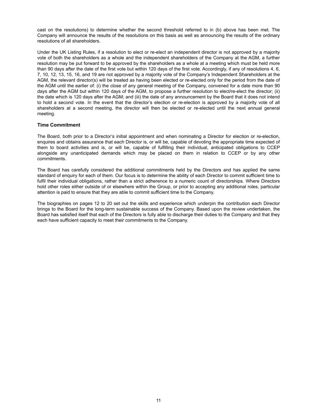 cast on the resolutions) to determine whether the second threshold referred to in (b) above has been met. The Company will announce the results of the resolutions on this basis as well as announcing the results of the ordinary resolutions of all shareholders. Under the UK Listing Rules, if a resolution to elect or re-elect an independent director is not approved by a majority vote of both the shareholders as a whole and the independent shareholders of the Company at the AGM, a further resolution may be put forward to be approved by the shareholders as a whole at a meeting which must be held more than 90 days after the date of the first vote but within 120 days of the first vote. Accordingly, if any of resolutions 4, 6, 7, 10, 12, 13, 15, 16, and 19 are not approved by a majority vote of the Company’s Independent Shareholders at the AGM, the relevant director(s) will be treated as having been elected or re-elected only for the period from the date of the AGM until the earlier of: (i) the close of any general meeting of the Company, convened for a date more than 90 days after the AGM but within 120 days of the AGM, to propose a further resolution to elect/re-elect the director; (ii) the date which is 120 days after the AGM; and (iii) the date of any announcement by the Board that it does not intend to hold a second vote. In the event that the director’s election or re-election is approved by a majority vote of all shareholders at a second meeting, the director will then be elected or re-elected until the next annual general meeting. Time Commitment The Board, both prior to a Director’s initial appointment and when nominating a Director for election or re-election, enquires and obtains assurance that each Director is, or will be, capable of devoting the appropriate time expected of them to board activities and is, or will be, capable of fulfilling their individual, anticipated obligations to CCEP alongside any unanticipated demands which may be placed on them in relation to CCEP or by any other commitments. The Board has carefully considered the additional commitments held by the Directors and has applied the same standard of enquiry for each of them. Our focus is to determine the ability of each Director to commit sufficient time to fulfil their individual obligations, rather than a strict adherence to a numeric count of directorships. Where Directors hold other roles either outside of or elsewhere within the Group, or prior to accepting any additional roles, particular attention is paid to ensure that they are able to commit sufficient time to the Company. The biographies on pages 12 to 20 set out the skills and experience which underpin the contribution each Director brings to the Board for the long-term sustainable success of the Company. Based upon the review undertaken, the Board has satisfied itself that each of the Directors is fully able to discharge their duties to the Company and that they each have sufficient capacity to meet their commitments to the Company. 11
