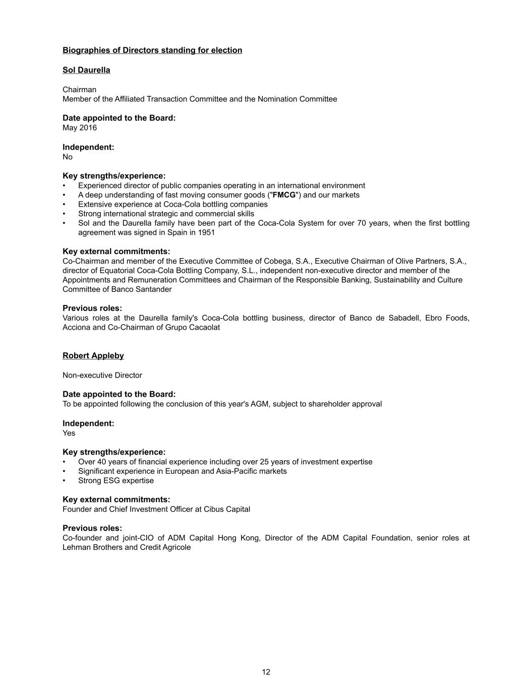 Biographies of Directors standing for election Sol Daurella Chairman Member of the Affiliated Transaction Committee and the Nomination Committee Date appointed to the Board: May 2016 Independent: No Key strengths/experience: • Experienced director of public companies operating in an international environment • A deep understanding of fast moving consumer goods ("FMCG") and our markets • Extensive experience at Coca-Cola bottling companies • Strong international strategic and commercial skills • Sol and the Daurella family have been part of the Coca-Cola System for over 70 years, when the first bottling agreement was signed in Spain in 1951 Key external commitments: Co-Chairman and member of the Executive Committee of Cobega, S.A., Executive Chairman of Olive Partners, S.A., director of Equatorial Coca-Cola Bottling Company, S.L., independent non-executive director and member of the Appointments and Remuneration Committees and Chairman of the Responsible Banking, Sustainability and Culture Committee of Banco Santander Previous roles: Various roles at the Daurella family's Coca-Cola bottling business, director of Banco de Sabadell, Ebro Foods, Acciona and Co-Chairman of Grupo Cacaolat Robert Appleby Non-executive Director Date appointed to the Board: To be appointed following the conclusion of this year's AGM, subject to shareholder approval Independent: Yes Key strengths/experience: • Over 40 years of financial experience including over 25 years of investment expertise • Significant experience in European and Asia-Pacific markets • Strong ESG expertise Key external commitments: Founder and Chief Investment Officer at Cibus Capital Previous roles: Co-founder and joint-CIO of ADM Capital Hong Kong, Director of the ADM Capital Foundation, senior roles at Lehman Brothers and Credit Agricole 12
