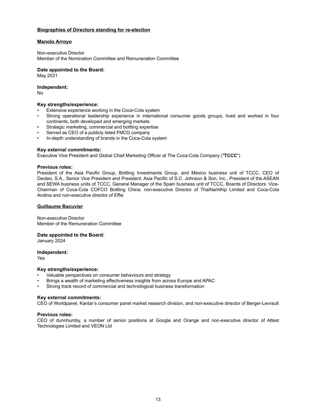 Biographies of Directors standing for re-election Manolo Arroyo Non-executive Director Member of the Nomination Committee and Remuneration Committee Date appointed to the Board: May 2021 Independent: No Key strengths/experience: • Extensive experience working in the Coca-Cola system • Strong operational leadership experience in international consumer goods groups, lived and worked in four continents, both developed and emerging markets • Strategic marketing, commercial and bottling expertise • Served as CEO of a publicly listed FMCG company • In-depth understanding of brands in the Coca-Cola system Key external commitments: Executive Vice President and Global Chief Marketing Officer at The Coca-Cola Company ("TCCC") Previous roles: President of the Asia Pacific Group, Bottling Investments Group, and Mexico business unit of TCCC, CEO of Deoleo, S.A., Senior Vice President and President, Asia Pacific of S.C. Johnson & Son, Inc., President of the ASEAN and SEWA business units of TCCC, General Manager of the Spain business unit of TCCC, Boards of Directors: Vice- Chairman of Coca-Cola COFCO Bottling China; non-executive Director of ThaiNamthip Limited and Coca-Cola Andina and non-executive director of Effie Guillaume Bacuvier Non-executive Director Member of the Remuneration Committee Date appointed to the Board: January 2024 Independent: Yes Key strengths/experience: • Valuable perspectives on consumer behaviours and strategy • Brings a wealth of marketing effectiveness insights from across Europe and APAC • Strong track record of commercial and technological business transformation Key external commitments: CEO of Worldpanel, Kantar’s consumer panel market research division, and non-executive director of Berger-Levrault Previous roles: CEO of dunnhumby, a number of senior positions at Google and Orange and non-executive director of Attest Technologies Limited and VEON Ltd 13