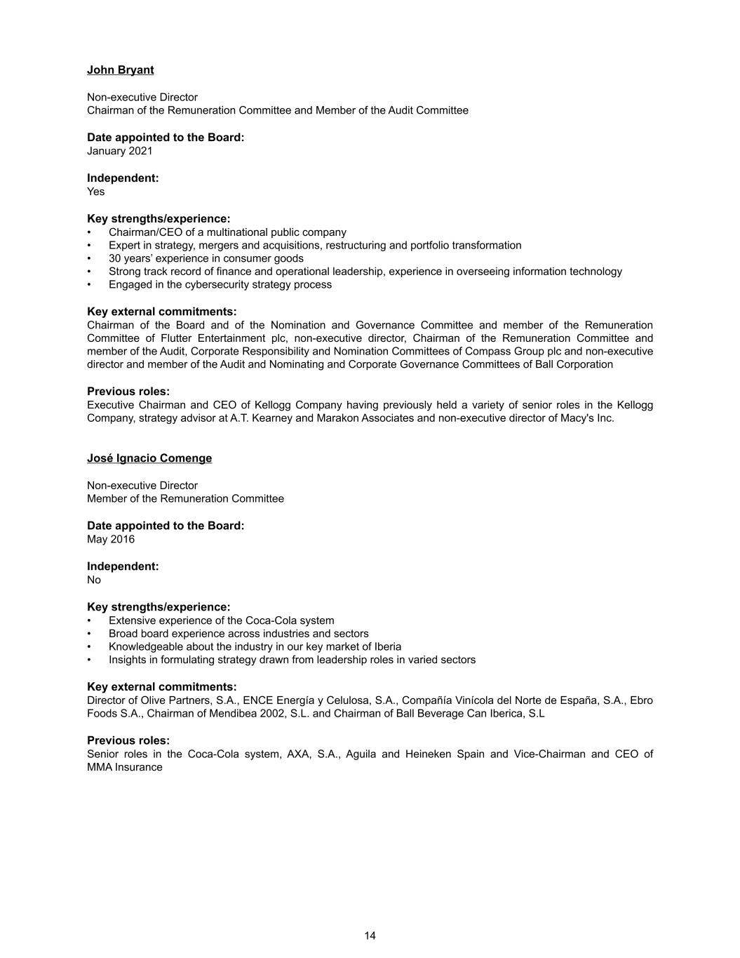 John Bryant Non-executive Director Chairman of the Remuneration Committee and Member of the Audit Committee Date appointed to the Board: January 2021 Independent: Yes Key strengths/experience: • Chairman/CEO of a multinational public company • Expert in strategy, mergers and acquisitions, restructuring and portfolio transformation • 30 years’ experience in consumer goods • Strong track record of finance and operational leadership, experience in overseeing information technology • Engaged in the cybersecurity strategy process Key external commitments: Chairman of the Board and of the Nomination and Governance Committee and member of the Remuneration Committee of Flutter Entertainment plc, non-executive director, Chairman of the Remuneration Committee and member of the Audit, Corporate Responsibility and Nomination Committees of Compass Group plc and non-executive director and member of the Audit and Nominating and Corporate Governance Committees of Ball Corporation Previous roles: Executive Chairman and CEO of Kellogg Company having previously held a variety of senior roles in the Kellogg Company, strategy advisor at A.T. Kearney and Marakon Associates and non-executive director of Macy's Inc. José Ignacio Comenge Non-executive Director Member of the Remuneration Committee Date appointed to the Board: May 2016 Independent: No Key strengths/experience: • Extensive experience of the Coca-Cola system • Broad board experience across industries and sectors • Knowledgeable about the industry in our key market of Iberia • Insights in formulating strategy drawn from leadership roles in varied sectors Key external commitments: Director of Olive Partners, S.A., ENCE Energía y Celulosa, S.A., Compañía Vinícola del Norte de España, S.A., Ebro Foods S.A., Chairman of Mendibea 2002, S.L. and Chairman of Ball Beverage Can Iberica, S.L Previous roles: Senior roles in the Coca-Cola system, AXA, S.A., Aguila and Heineken Spain and Vice-Chairman and CEO of MMA Insurance 14