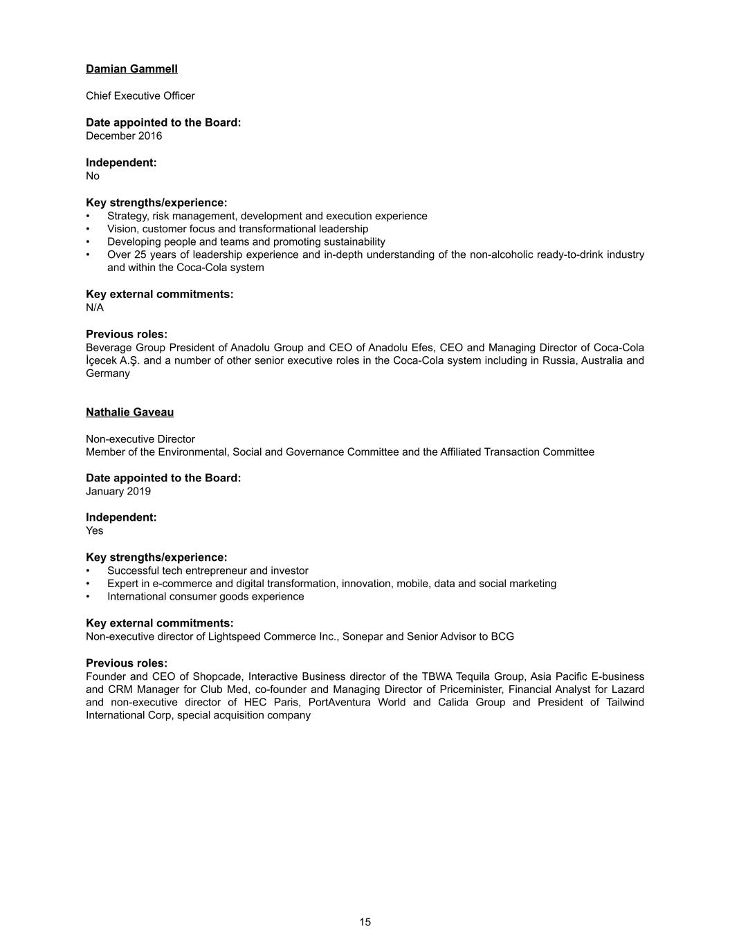 Damian Gammell Chief Executive Officer Date appointed to the Board: December 2016 Independent: No Key strengths/experience: • Strategy, risk management, development and execution experience • Vision, customer focus and transformational leadership • Developing people and teams and promoting sustainability • Over 25 years of leadership experience and in-depth understanding of the non-alcoholic ready-to-drink industry and within the Coca-Cola system Key external commitments: N/A Previous roles: Beverage Group President of Anadolu Group and CEO of Anadolu Efes, CEO and Managing Director of Coca-Cola İçecek A.Ş. and a number of other senior executive roles in the Coca-Cola system including in Russia, Australia and Germany Nathalie Gaveau Non-executive Director Member of the Environmental, Social and Governance Committee and the Affiliated Transaction Committee Date appointed to the Board: January 2019 Independent: Yes Key strengths/experience: • Successful tech entrepreneur and investor • Expert in e-commerce and digital transformation, innovation, mobile, data and social marketing • International consumer goods experience Key external commitments: Non-executive director of Lightspeed Commerce Inc., Sonepar and Senior Advisor to BCG Previous roles: Founder and CEO of Shopcade, Interactive Business director of the TBWA Tequila Group, Asia Pacific E-business and CRM Manager for Club Med, co-founder and Managing Director of Priceminister, Financial Analyst for Lazard and non-executive director of HEC Paris, PortAventura World and Calida Group and President of Tailwind International Corp, special acquisition company 15