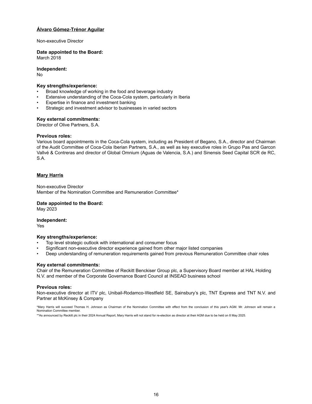Álvaro Gómez-Trénor Aguilar Non-executive Director Date appointed to the Board: March 2018 Independent: No Key strengths/experience: • Broad knowledge of working in the food and beverage industry • Extensive understanding of the Coca-Cola system, particularly in Iberia • Expertise in finance and investment banking • Strategic and investment advisor to businesses in varied sectors Key external commitments: Director of Olive Partners, S.A. Previous roles: Various board appointments in the Coca-Cola system, including as President of Begano, S.A., director and Chairman of the Audit Committee of Coca-Cola Iberian Partners, S.A., as well as key executive roles in Grupo Pas and Garcon Vallvé & Contreras and director of Global Omnium (Aguas de Valencia, S.A.) and Sinensis Seed Capital SCR de RC, S.A. Mary Harris Non-executive Director Member of the Nomination Committee and Remuneration Committee* Date appointed to the Board: May 2023 Independent: Yes Key strengths/experience: • Top level strategic outlook with international and consumer focus • Significant non-executive director experience gained from other major listed companies • Deep understanding of remuneration requirements gained from previous Remuneration Committee chair roles Key external commitments: Chair of the Remuneration Committee of Reckitt Benckiser Group plc, a Supervisory Board member at HAL Holding N.V. and member of the Corporate Governance Board Council at INSEAD business school Previous roles: Non-executive director at ITV plc, Unibail-Rodamco-Westfield SE, Sainsbury’s plc, TNT Express and TNT N.V. and Partner at McKinsey & Company *Mary Harris will succeed Thomas H. Johnson as Chairman of the Nomination Committee with effect from the conclusion of this year's AGM. Mr. Johnson will remain a Nomination Committee member. **As announced by Reckitt plc in their 2024 Annual Report, Mary Harris will not stand for re-election as director at their AGM due to be held on 8 May 2025. 16
