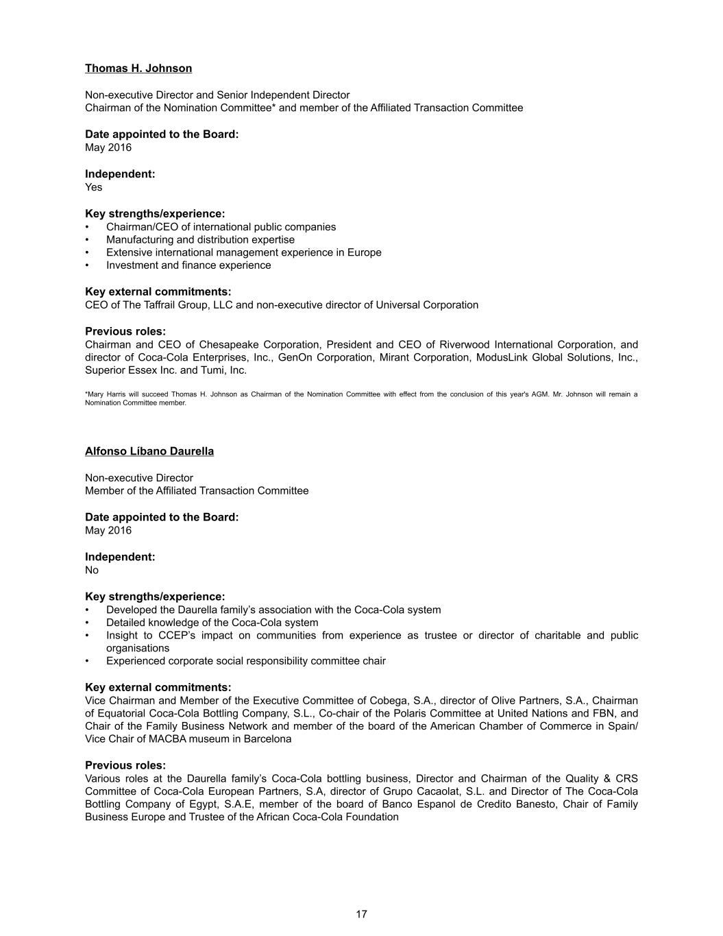 Thomas H. Johnson Non-executive Director and Senior Independent Director Chairman of the Nomination Committee* and member of the Affiliated Transaction Committee Date appointed to the Board: May 2016 Independent: Yes Key strengths/experience: • Chairman/CEO of international public companies • Manufacturing and distribution expertise • Extensive international management experience in Europe • Investment and finance experience Key external commitments: CEO of The Taffrail Group, LLC and non-executive director of Universal Corporation Previous roles: Chairman and CEO of Chesapeake Corporation, President and CEO of Riverwood International Corporation, and director of Coca-Cola Enterprises, Inc., GenOn Corporation, Mirant Corporation, ModusLink Global Solutions, Inc., Superior Essex Inc. and Tumi, Inc. *Mary Harris will succeed Thomas H. Johnson as Chairman of the Nomination Committee with effect from the conclusion of this year's AGM. Mr. Johnson will remain a Nomination Committee member. Alfonso Líbano Daurella Non-executive Director Member of the Affiliated Transaction Committee Date appointed to the Board: May 2016 Independent: No Key strengths/experience: • Developed the Daurella family’s association with the Coca-Cola system • Detailed knowledge of the Coca-Cola system • Insight to CCEP’s impact on communities from experience as trustee or director of charitable and public organisations • Experienced corporate social responsibility committee chair Key external commitments: Vice Chairman and Member of the Executive Committee of Cobega, S.A., director of Olive Partners, S.A., Chairman of Equatorial Coca-Cola Bottling Company, S.L., Co-chair of the Polaris Committee at United Nations and FBN, and Chair of the Family Business Network and member of the board of the American Chamber of Commerce in Spain/ Vice Chair of MACBA museum in Barcelona Previous roles: Various roles at the Daurella family’s Coca-Cola bottling business, Director and Chairman of the Quality & CRS Committee of Coca-Cola European Partners, S.A, director of Grupo Cacaolat, S.L. and Director of The Coca-Cola Bottling Company of Egypt, S.A.E, member of the board of Banco Espanol de Credito Banesto, Chair of Family Business Europe and Trustee of the African Coca-Cola Foundation 17