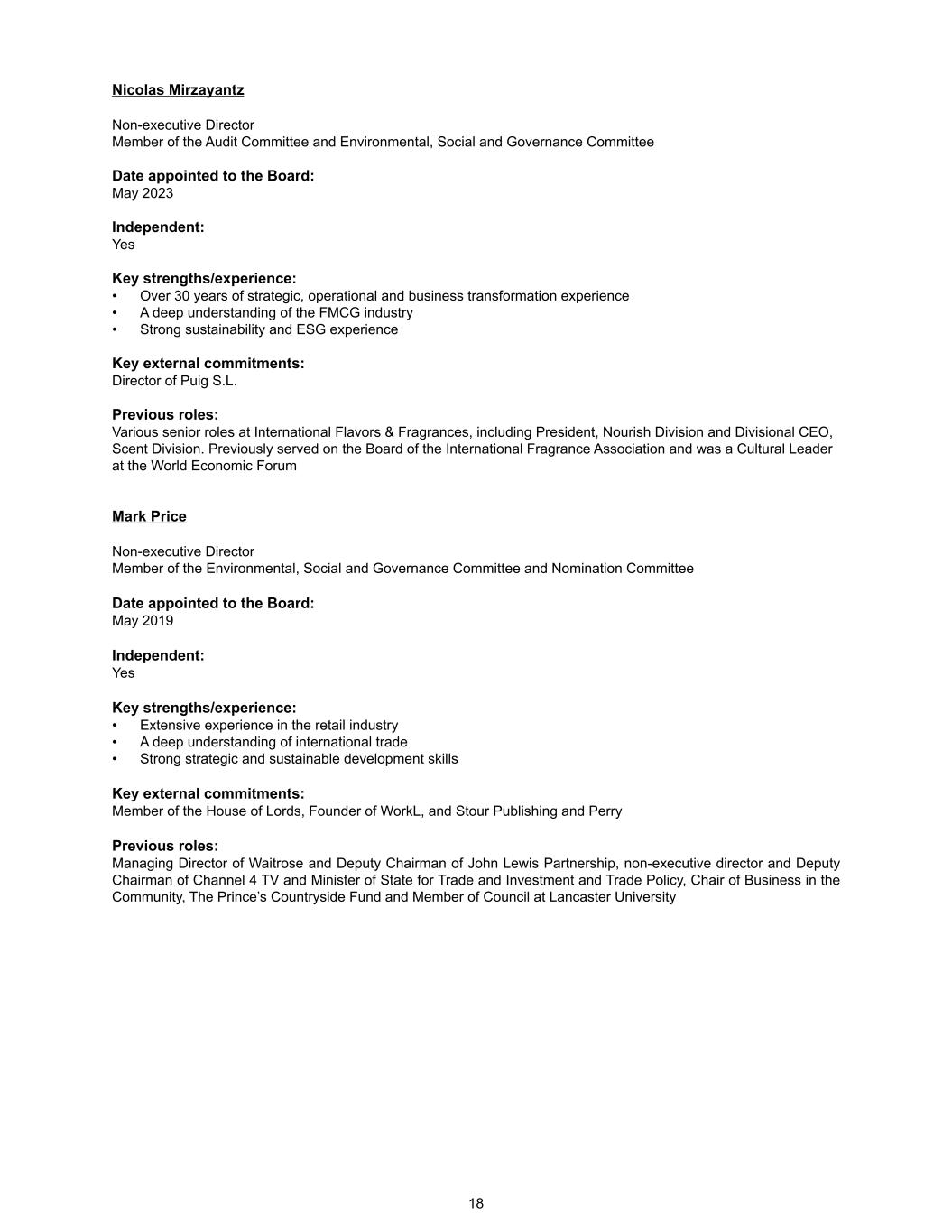 Nicolas Mirzayantz Non-executive Director Member of the Audit Committee and Environmental, Social and Governance Committee Date appointed to the Board: May 2023 Independent: Yes Key strengths/experience: • Over 30 years of strategic, operational and business transformation experience • A deep understanding of the FMCG industry • Strong sustainability and ESG experience Key external commitments: Director of Puig S.L. Previous roles: Various senior roles at International Flavors & Fragrances, including President, Nourish Division and Divisional CEO, Scent Division. Previously served on the Board of the International Fragrance Association and was a Cultural Leader at the World Economic Forum Mark Price Non-executive Director Member of the Environmental, Social and Governance Committee and Nomination Committee Date appointed to the Board: May 2019 Independent: Yes Key strengths/experience: • Extensive experience in the retail industry • A deep understanding of international trade • Strong strategic and sustainable development skills Key external commitments: Member of the House of Lords, Founder of WorkL, and Stour Publishing and Perry Previous roles: Managing Director of Waitrose and Deputy Chairman of John Lewis Partnership, non-executive director and Deputy Chairman of Channel 4 TV and Minister of State for Trade and Investment and Trade Policy, Chair of Business in the Community, The Prince’s Countryside Fund and Member of Council at Lancaster University 18