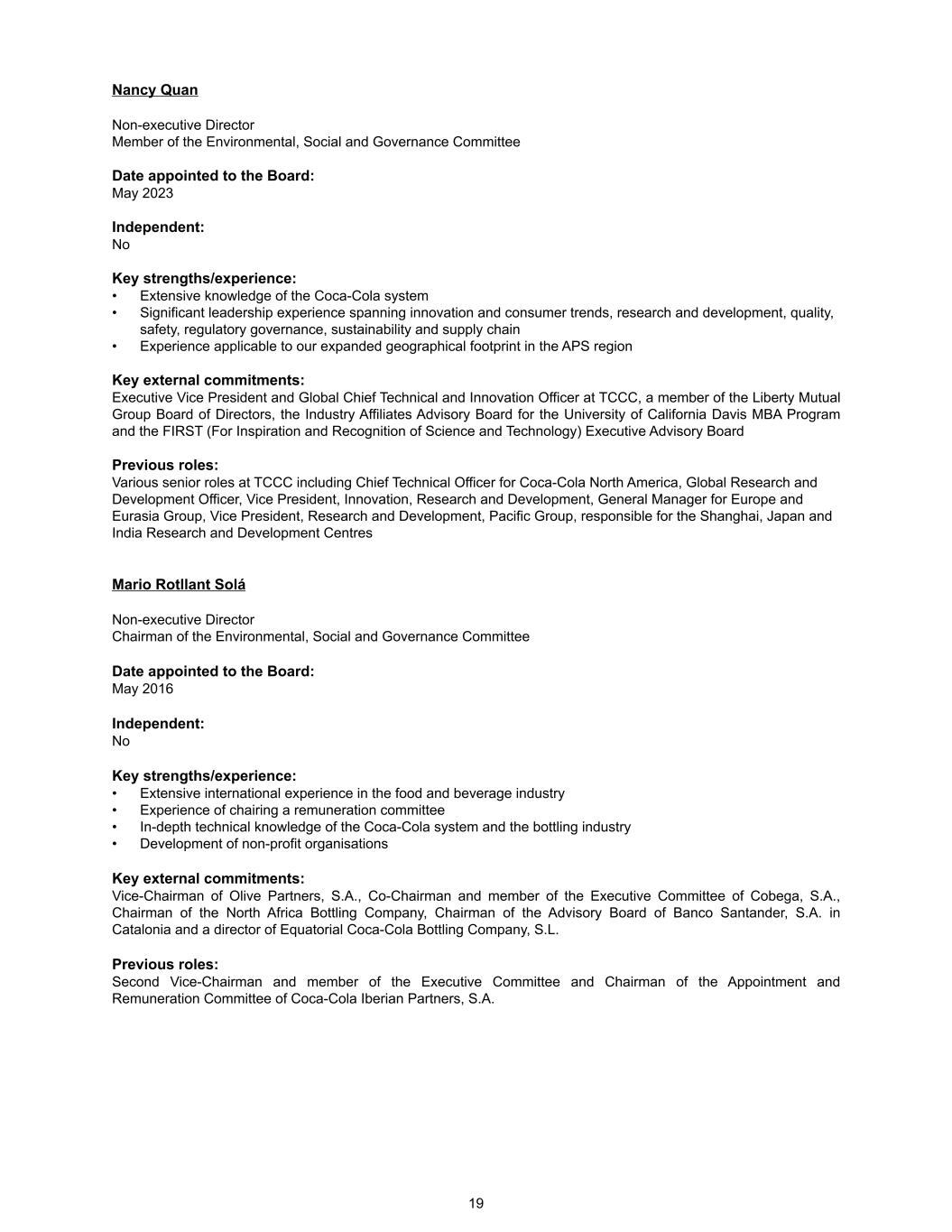 Nancy Quan Non-executive Director Member of the Environmental, Social and Governance Committee Date appointed to the Board: May 2023 Independent: No Key strengths/experience: • Extensive knowledge of the Coca-Cola system • Significant leadership experience spanning innovation and consumer trends, research and development, quality, safety, regulatory governance, sustainability and supply chain • Experience applicable to our expanded geographical footprint in the APS region Key external commitments: Executive Vice President and Global Chief Technical and Innovation Officer at TCCC, a member of the Liberty Mutual Group Board of Directors, the Industry Affiliates Advisory Board for the University of California Davis MBA Program and the FIRST (For Inspiration and Recognition of Science and Technology) Executive Advisory Board Previous roles: Various senior roles at TCCC including Chief Technical Officer for Coca-Cola North America, Global Research and Development Officer, Vice President, Innovation, Research and Development, General Manager for Europe and Eurasia Group, Vice President, Research and Development, Pacific Group, responsible for the Shanghai, Japan and India Research and Development Centres Mario Rotllant Solá Non-executive Director Chairman of the Environmental, Social and Governance Committee Date appointed to the Board: May 2016 Independent: No Key strengths/experience: • Extensive international experience in the food and beverage industry • Experience of chairing a remuneration committee • In-depth technical knowledge of the Coca-Cola system and the bottling industry • Development of non-profit organisations Key external commitments: Vice-Chairman of Olive Partners, S.A., Co-Chairman and member of the Executive Committee of Cobega, S.A., Chairman of the North Africa Bottling Company, Chairman of the Advisory Board of Banco Santander, S.A. in Catalonia and a director of Equatorial Coca-Cola Bottling Company, S.L. Previous roles: Second Vice-Chairman and member of the Executive Committee and Chairman of the Appointment and Remuneration Committee of Coca-Cola Iberian Partners, S.A. 19
