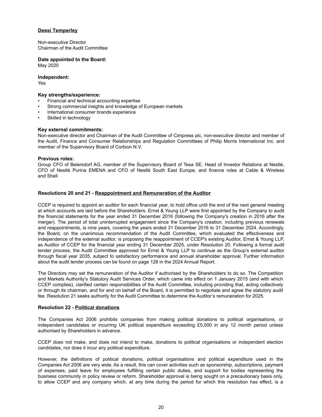 Dessi Temperley Non-executive Director Chairman of the Audit Committee Date appointed to the Board: May 2020 Independent: Yes Key strengths/experience: • Financial and technical accounting expertise • Strong commercial insights and knowledge of European markets • International consumer brands experience • Skilled in technology Key external commitments: Non-executive director and Chairman of the Audit Committee of Cimpress plc, non-executive director and member of the Audit, Finance and Consumer Relationships and Regulation Committees of Philip Morris International Inc. and member of the Supervisory Board of Corbion N.V. Previous roles: Group CFO of Beiersdorf AG, member of the Supervisory Board of Tesa SE, Head of Investor Relations at Nestlé, CFO of Nestlé Purina EMENA and CFO of Nestlé South East Europe, and finance roles at Cable & Wireless and Shell Resolutions 20 and 21 - Reappointment and Remuneration of the Auditor CCEP is required to appoint an auditor for each financial year, to hold office until the end of the next general meeting at which accounts are laid before the Shareholders. Ernst & Young LLP were first appointed by the Company to audit the financial statements for the year ended 31 December 2016 (following the Company's creation in 2016 after the merger). The period of total uninterrupted engagement since the Company's creation, including previous renewals and reappointments, is nine years, covering the years ended 31 December 2016 to 31 December 2024. Accordingly, the Board, on the unanimous recommendation of the Audit Committee, which evaluated the effectiveness and independence of the external auditor, is proposing the reappointment of CCEP's existing Auditor, Ernst & Young LLP, as Auditor of CCEP for the financial year ending 31 December 2025, under Resolution 20. Following a formal audit tender process, the Audit Committee approved for Ernst & Young LLP to continue as the Group’s external auditor through fiscal year 2035, subject to satisfactory performance and annual shareholder approval. Further information about the audit tender process can be found on page 128 in the 2024 Annual Report. The Directors may set the remuneration of the Auditor if authorised by the Shareholders to do so. The Competition and Markets Authority’s Statutory Audit Services Order, which came into effect on 1 January 2015 (and with which CCEP complies), clarified certain responsibilities of the Audit Committee, including providing that, acting collectively or through its chairman, and for and on behalf of the Board, it is permitted to negotiate and agree the statutory audit fee. Resolution 21 seeks authority for the Audit Committee to determine the Auditor’s remuneration for 2025. Resolution 22 - Political donations The Companies Act 2006 prohibits companies from making political donations to political organisations, or independent candidates or incurring UK political expenditure exceeding £5,000 in any 12 month period unless authorised by Shareholders in advance. CCEP does not make, and does not intend to make, donations to political organisations or independent election candidates, nor does it incur any political expenditure. However, the definitions of political donations, political organisations and political expenditure used in the Companies Act 2006 are very wide. As a result, this can cover activities such as sponsorship, subscriptions, payment of expenses, paid leave for employees fulfilling certain public duties, and support for bodies representing the business community in policy review or reform. Shareholder approval is being sought on a precautionary basis only, to allow CCEP and any company which, at any time during the period for which this resolution has effect, is a 20