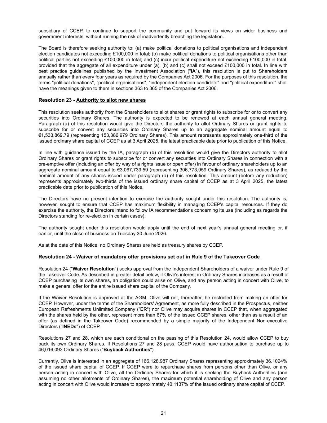 subsidiary of CCEP, to continue to support the community and put forward its views on wider business and government interests, without running the risk of inadvertently breaching the legislation. The Board is therefore seeking authority to: (a) make political donations to political organisations and independent election candidates not exceeding £100,000 in total; (b) make political donations to political organisations other than political parties not exceeding £100,000 in total; and (c) incur political expenditure not exceeding £100,000 in total, provided that the aggregate of all expenditure under (a), (b) and (c) shall not exceed £100,000 in total. In line with best practice guidelines published by the Investment Association ("IA"), this resolution is put to Shareholders annually rather than every four years as required by the Companies Act 2006. For the purposes of this resolution, the terms "political donations", "political organisations", "independent election candidate" and "political expenditure" shall have the meanings given to them in sections 363 to 365 of the Companies Act 2006. Resolution 23 - Authority to allot new shares This resolution seeks authority from the Shareholders to allot shares or grant rights to subscribe for or to convert any securities into Ordinary Shares. The authority is expected to be renewed at each annual general meeting. Paragraph (a) of this resolution would give the Directors the authority to allot Ordinary Shares or grant rights to subscribe for or convert any securities into Ordinary Shares up to an aggregate nominal amount equal to €1,533,869.79 (representing 153,386,979 Ordinary Shares). This amount represents approximately one-third of the issued ordinary share capital of CCEP as at 3 April 2025, the latest practicable date prior to publication of this Notice. In line with guidance issued by the IA, paragraph (b) of this resolution would give the Directors authority to allot Ordinary Shares or grant rights to subscribe for or convert any securities into Ordinary Shares in connection with a pre-emptive offer (including an offer by way of a rights issue or open offer) in favour of ordinary shareholders up to an aggregate nominal amount equal to €3,067,739.59 (representing 306,773,959 Ordinary Shares), as reduced by the nominal amount of any shares issued under paragraph (a) of this resolution. This amount (before any reduction) represents approximately two-thirds of the issued ordinary share capital of CCEP as at 3 April 2025, the latest practicable date prior to publication of this Notice. The Directors have no present intention to exercise the authority sought under this resolution. The authority is, however, sought to ensure that CCEP has maximum flexibility in managing CCEP's capital resources. If they do exercise the authority, the Directors intend to follow IA recommendations concerning its use (including as regards the Directors standing for re-election in certain cases). The authority sought under this resolution would apply until the end of next year’s annual general meeting or, if earlier, until the close of business on Tuesday 30 June 2026. As at the date of this Notice, no Ordinary Shares are held as treasury shares by CCEP. Resolution 24 - Waiver of mandatory offer provisions set out in Rule 9 of the Takeover Code Resolution 24 ("Waiver Resolution") seeks approval from the Independent Shareholders of a waiver under Rule 9 of the Takeover Code. As described in greater detail below, if Olive's interest in Ordinary Shares increases as a result of CCEP purchasing its own shares, an obligation could arise on Olive, and any person acting in concert with Olive, to make a general offer for the entire issued share capital of the Company. If the Waiver Resolution is approved at the AGM, Olive will not, thereafter, be restricted from making an offer for CCEP. However, under the terms of the Shareholders' Agreement, as more fully described in the Prospectus, neither European Refreshments Unlimited Company ("ER") nor Olive may acquire shares in CCEP that, when aggregated with the shares held by the other, represent more than 67% of the issued CCEP shares, other than as a result of an offer (as defined in the Takeover Code) recommended by a simple majority of the Independent Non-executive Directors ("INEDs") of CCEP. Resolutions 27 and 28, which are each conditional on the passing of this Resolution 24, would allow CCEP to buy back its own Ordinary Shares. If Resolutions 27 and 28 pass, CCEP would have authorisation to purchase up to 46,016,093 Ordinary Shares ("Buyback Authorities"). Currently, Olive is interested in an aggregate of 166,128,987 Ordinary Shares representing approximately 36.1024% of the issued share capital of CCEP. If CCEP were to repurchase shares from persons other than Olive, or any person acting in concert with Olive, all the Ordinary Shares for which it is seeking the Buyback Authorities (and assuming no other allotments of Ordinary Shares), the maximum potential shareholding of Olive and any person acting in concert with Olive would increase to approximately 40.1137% of the issued ordinary share capital of CCEP. 21