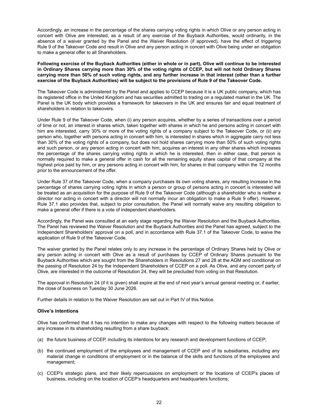 Accordingly, an increase in the percentage of the shares carrying voting rights in which Olive or any person acting in concert with Olive are interested, as a result of any exercise of the Buyback Authorities, would ordinarily, in the absence of a waiver granted by the Panel and the Waiver Resolution (if approved), have the effect of triggering Rule 9 of the Takeover Code and result in Olive and any person acting in concert with Olive being under an obligation to make a general offer to all Shareholders. Following exercise of the Buyback Authorities (either in whole or in part), Olive will continue to be interested in Ordinary Shares carrying more than 30% of the voting rights of CCEP, but will not hold Ordinary Shares carrying more than 50% of such voting rights, and any further increase in that interest (other than a further exercise of the Buyback Authorities) will be subject to the provisions of Rule 9 of the Takeover Code. The Takeover Code is administered by the Panel and applies to CCEP because it is a UK public company, which has its registered office in the United Kingdom and has securities admitted to trading on a regulated market in the UK. The Panel is the UK body which provides a framework for takeovers in the UK and ensures fair and equal treatment of shareholders in relation to takeovers. Under Rule 9 of the Takeover Code, when (i) any person acquires, whether by a series of transactions over a period of time or not, an interest in shares which, taken together with shares in which he and persons acting in concert with him are interested, carry 30% or more of the voting rights of a company subject to the Takeover Code, or (ii) any person who, together with persons acting in concert with him, is interested in shares which in aggregate carry not less than 30% of the voting rights of a company, but does not hold shares carrying more than 50% of such voting rights and such person, or any person acting in concert with him, acquires an interest in any other shares which increases the percentage of the shares carrying voting rights in which he is interested, then in either case, that person is normally required to make a general offer in cash for all the remaining equity share capital of that company at the highest price paid by him, or any persons acting in concert with him, for shares in that company within the 12 months prior to the announcement of the offer. Under Rule 37 of the Takeover Code, when a company purchases its own voting shares, any resulting increase in the percentage of shares carrying voting rights in which a person or group of persons acting in concert is interested will be treated as an acquisition for the purpose of Rule 9 of the Takeover Code (although a shareholder who is neither a director nor acting in concert with a director will not normally incur an obligation to make a Rule 9 offer). However, Rule 37.1 also provides that, subject to prior consultation, the Panel will normally waive any resulting obligation to make a general offer if there is a vote of independent shareholders. Accordingly, the Panel was consulted at an early stage regarding the Waiver Resolution and the Buyback Authorities. The Panel has reviewed the Waiver Resolution and the Buyback Authorities and the Panel has agreed, subject to the Independent Shareholders’ approval on a poll, and in accordance with Rule 37.1 of the Takeover Code, to waive the application of Rule 9 of the Takeover Code. The waiver granted by the Panel relates only to any increase in the percentage of Ordinary Shares held by Olive or any person acting in concert with Olive as a result of purchases by CCEP of Ordinary Shares pursuant to the Buyback Authorities which are sought from the Shareholders in Resolutions 27 and 28 at the AGM and conditional on the passing of Resolution 24 by the Independent Shareholders of CCEP on a poll. As Olive, and any concert party of Olive, are interested in the outcome of Resolution 24, they will be precluded from voting on that Resolution. The approval in Resolution 24 (if it is given) shall expire at the end of next year’s annual general meeting or, if earlier, the close of business on Tuesday 30 June 2026. Further details in relation to the Waiver Resolution are set out in Part IV of this Notice. Olive’s intentions Olive has confirmed that it has no intention to make any changes with respect to the following matters because of any increase in its shareholding resulting from a share buyback: (a) the future business of CCEP, including its intentions for any research and development functions of CCEP; (b) the continued employment of the employees and management of CCEP and of its subsidiaries, including any material change in conditions of employment or in the balance of the skills and functions of the employees and management; (c) CCEP's strategic plans, and their likely repercussions on employment or the locations of CCEP's places of business, including on the location of CCEP’s headquarters and headquarters functions; 22