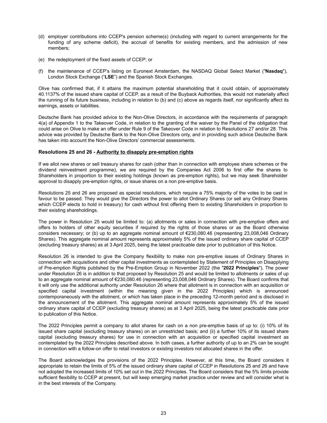 (d) employer contributions into CCEP's pension scheme(s) (including with regard to current arrangements for the funding of any scheme deficit), the accrual of benefits for existing members, and the admission of new members; (e) the redeployment of the fixed assets of CCEP; or (f) the maintenance of CCEP’s listing on Euronext Amsterdam, the NASDAQ Global Select Market ("Nasdaq"), London Stock Exchange (“LSE”) and the Spanish Stock Exchanges. Olive has confirmed that, if it attains the maximum potential shareholding that it could obtain, of approximately 40.1137% of the issued share capital of CCEP, as a result of the Buyback Authorities, this would not materially affect the running of its future business, including in relation to (b) and (c) above as regards itself, nor significantly affect its earnings, assets or liabilities. Deutsche Bank has provided advice to the Non-Olive Directors, in accordance with the requirements of paragraph 4(a) of Appendix 1 to the Takeover Code, in relation to the granting of the waiver by the Panel of the obligation that could arise on Olive to make an offer under Rule 9 of the Takeover Code in relation to Resolutions 27 and/or 28. This advice was provided by Deutsche Bank to the Non-Olive Directors only, and in providing such advice Deutsche Bank has taken into account the Non-Olive Directors’ commercial assessments. Resolutions 25 and 26 - Authority to disapply pre-emption rights If we allot new shares or sell treasury shares for cash (other than in connection with employee share schemes or the dividend reinvestment programme), we are required by the Companies Act 2006 to first offer the shares to Shareholders in proportion to their existing holdings (known as pre-emption rights), but we may seek Shareholder approval to disapply pre-emption rights, or issue shares on a non pre-emptive basis. Resolutions 25 and 26 are proposed as special resolutions, which require a 75% majority of the votes to be cast in favour to be passed. They would give the Directors the power to allot Ordinary Shares (or sell any Ordinary Shares which CCEP elects to hold in treasury) for cash without first offering them to existing Shareholders in proportion to their existing shareholdings. The power in Resolution 25 would be limited to: (a) allotments or sales in connection with pre-emptive offers and offers to holders of other equity securities if required by the rights of those shares or as the Board otherwise considers necessary; or (b) up to an aggregate nominal amount of €230,080.46 (representing 23,008,046 Ordinary Shares). This aggregate nominal amount represents approximately 5% of the issued ordinary share capital of CCEP (excluding treasury shares) as at 3 April 2025, being the latest practicable date prior to publication of this Notice. Resolution 26 is intended to give the Company flexibility to make non pre-emptive issues of Ordinary Shares in connection with acquisitions and other capital investments as contemplated by Statement of Principles on Disapplying of Pre-emption Rights published by the Pre-Emption Group in November 2022 (the "2022 Principles"). The power under Resolution 26 is in addition to that proposed by Resolution 25 and would be limited to allotments or sales of up to an aggregate nominal amount of €230,080.46 (representing 23,008,046 Ordinary Shares). The Board confirms that it will only use the additional authority under Resolution 26 where that allotment is in connection with an acquisition or specified capital investment (within the meaning given in the 2022 Principles) which is announced contemporaneously with the allotment, or which has taken place in the preceding 12-month period and is disclosed in the announcement of the allotment. This aggregate nominal amount represents approximately 5% of the issued ordinary share capital of CCEP (excluding treasury shares) as at 3 April 2025, being the latest practicable date prior to publication of this Notice. The 2022 Principles permit a company to allot shares for cash on a non pre-emptive basis of up to: (i) 10% of its issued share capital (excluding treasury shares) on an unrestricted basis; and (ii) a further 10% of its issued share capital (excluding treasury shares) for use in connection with an acquisition or specified capital investment as contemplated by the 2022 Principles described above. In both cases, a further authority of up to an 2% can be sought in connection with a follow-on offer to retail investors or existing investors not allocated shares in the offer. The Board acknowledges the provisions of the 2022 Principles. However, at this time, the Board considers it appropriate to retain the limits of 5% of the issued ordinary share capital of CCEP in Resolutions 25 and 26 and have not adopted the increased limits of 10% set out in the 2022 Principles. The Board considers that the 5% limits provide sufficient flexibility to CCEP at present, but will keep emerging market practice under review and will consider what is in the best interests of the Company. 23