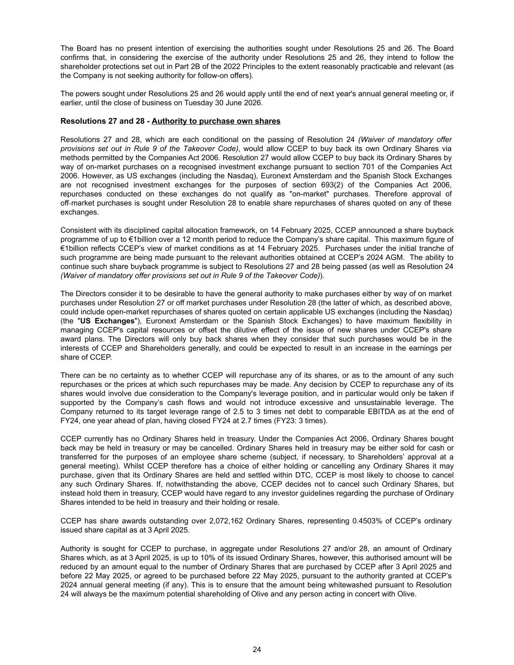 The Board has no present intention of exercising the authorities sought under Resolutions 25 and 26. The Board confirms that, in considering the exercise of the authority under Resolutions 25 and 26, they intend to follow the shareholder protections set out in Part 2B of the 2022 Principles to the extent reasonably practicable and relevant (as the Company is not seeking authority for follow-on offers). The powers sought under Resolutions 25 and 26 would apply until the end of next year's annual general meeting or, if earlier, until the close of business on Tuesday 30 June 2026. Resolutions 27 and 28 - Authority to purchase own shares Resolutions 27 and 28, which are each conditional on the passing of Resolution 24 (Waiver of mandatory offer provisions set out in Rule 9 of the Takeover Code), would allow CCEP to buy back its own Ordinary Shares via methods permitted by the Companies Act 2006. Resolution 27 would allow CCEP to buy back its Ordinary Shares by way of on-market purchases on a recognised investment exchange pursuant to section 701 of the Companies Act 2006. However, as US exchanges (including the Nasdaq), Euronext Amsterdam and the Spanish Stock Exchanges are not recognised investment exchanges for the purposes of section 693(2) of the Companies Act 2006, repurchases conducted on these exchanges do not qualify as "on-market" purchases. Therefore approval of off-market purchases is sought under Resolution 28 to enable share repurchases of shares quoted on any of these exchanges. Consistent with its disciplined capital allocation framework, on 14 February 2025, CCEP announced a share buyback programme of up to €1billion over a 12 month period to reduce the Company’s share capital. This maximum figure of €1billion reflects CCEP’s view of market conditions as at 14 February 2025. Purchases under the initial tranche of such programme are being made pursuant to the relevant authorities obtained at CCEP’s 2024 AGM. The ability to continue such share buyback programme is subject to Resolutions 27 and 28 being passed (as well as Resolution 24 (Waiver of mandatory offer provisions set out in Rule 9 of the Takeover Code)). The Directors consider it to be desirable to have the general authority to make purchases either by way of on market purchases under Resolution 27 or off market purchases under Resolution 28 (the latter of which, as described above, could include open-market repurchases of shares quoted on certain applicable US exchanges (including the Nasdaq) (the "US Exchanges"), Euronext Amsterdam or the Spanish Stock Exchanges) to have maximum flexibility in managing CCEP's capital resources or offset the dilutive effect of the issue of new shares under CCEP's share award plans. The Directors will only buy back shares when they consider that such purchases would be in the interests of CCEP and Shareholders generally, and could be expected to result in an increase in the earnings per share of CCEP. There can be no certainty as to whether CCEP will repurchase any of its shares, or as to the amount of any such repurchases or the prices at which such repurchases may be made. Any decision by CCEP to repurchase any of its shares would involve due consideration to the Company's leverage position, and in particular would only be taken if supported by the Company’s cash flows and would not introduce excessive and unsustainable leverage. The Company returned to its target leverage range of 2.5 to 3 times net debt to comparable EBITDA as at the end of FY24, one year ahead of plan, having closed FY24 at 2.7 times (FY23: 3 times). CCEP currently has no Ordinary Shares held in treasury. Under the Companies Act 2006, Ordinary Shares bought back may be held in treasury or may be cancelled. Ordinary Shares held in treasury may be either sold for cash or transferred for the purposes of an employee share scheme (subject, if necessary, to Shareholders’ approval at a general meeting). Whilst CCEP therefore has a choice of either holding or cancelling any Ordinary Shares it may purchase, given that its Ordinary Shares are held and settled within DTC, CCEP is most likely to choose to cancel any such Ordinary Shares. If, notwithstanding the above, CCEP decides not to cancel such Ordinary Shares, but instead hold them in treasury, CCEP would have regard to any investor guidelines regarding the purchase of Ordinary Shares intended to be held in treasury and their holding or resale. CCEP has share awards outstanding over 2,072,162 Ordinary Shares, representing 0.4503% of CCEP’s ordinary issued share capital as at 3 April 2025. Authority is sought for CCEP to purchase, in aggregate under Resolutions 27 and/or 28, an amount of Ordinary Shares which, as at 3 April 2025, is up to 10% of its issued Ordinary Shares, however, this authorised amount will be reduced by an amount equal to the number of Ordinary Shares that are purchased by CCEP after 3 April 2025 and before 22 May 2025, or agreed to be purchased before 22 May 2025, pursuant to the authority granted at CCEP’s 2024 annual general meeting (if any). This is to ensure that the amount being whitewashed pursuant to Resolution 24 will always be the maximum potential shareholding of Olive and any person acting in concert with Olive. 24