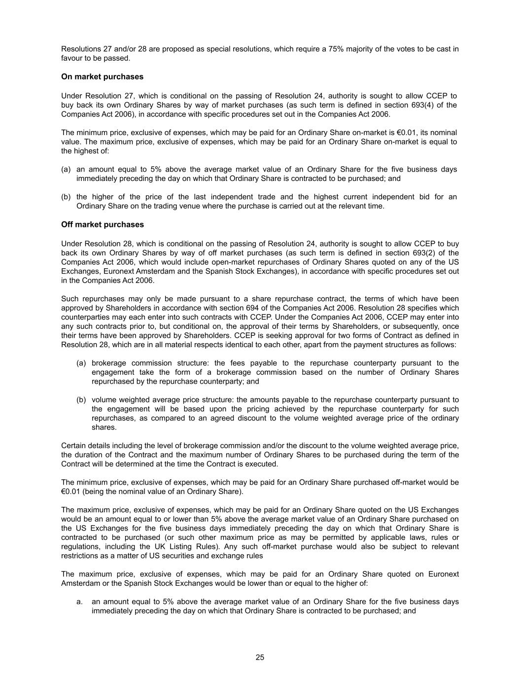 Resolutions 27 and/or 28 are proposed as special resolutions, which require a 75% majority of the votes to be cast in favour to be passed. On market purchases Under Resolution 27, which is conditional on the passing of Resolution 24, authority is sought to allow CCEP to buy back its own Ordinary Shares by way of market purchases (as such term is defined in section 693(4) of the Companies Act 2006), in accordance with specific procedures set out in the Companies Act 2006. The minimum price, exclusive of expenses, which may be paid for an Ordinary Share on-market is €0.01, its nominal value. The maximum price, exclusive of expenses, which may be paid for an Ordinary Share on-market is equal to the highest of: (a) an amount equal to 5% above the average market value of an Ordinary Share for the five business days immediately preceding the day on which that Ordinary Share is contracted to be purchased; and (b) the higher of the price of the last independent trade and the highest current independent bid for an Ordinary Share on the trading venue where the purchase is carried out at the relevant time. Off market purchases Under Resolution 28, which is conditional on the passing of Resolution 24, authority is sought to allow CCEP to buy back its own Ordinary Shares by way of off market purchases (as such term is defined in section 693(2) of the Companies Act 2006, which would include open-market repurchases of Ordinary Shares quoted on any of the US Exchanges, Euronext Amsterdam and the Spanish Stock Exchanges), in accordance with specific procedures set out in the Companies Act 2006. Such repurchases may only be made pursuant to a share repurchase contract, the terms of which have been approved by Shareholders in accordance with section 694 of the Companies Act 2006. Resolution 28 specifies which counterparties may each enter into such contracts with CCEP. Under the Companies Act 2006, CCEP may enter into any such contracts prior to, but conditional on, the approval of their terms by Shareholders, or subsequently, once their terms have been approved by Shareholders. CCEP is seeking approval for two forms of Contract as defined in Resolution 28, which are in all material respects identical to each other, apart from the payment structures as follows: (a) brokerage commission structure: the fees payable to the repurchase counterparty pursuant to the engagement take the form of a brokerage commission based on the number of Ordinary Shares repurchased by the repurchase counterparty; and (b) volume weighted average price structure: the amounts payable to the repurchase counterparty pursuant to the engagement will be based upon the pricing achieved by the repurchase counterparty for such repurchases, as compared to an agreed discount to the volume weighted average price of the ordinary shares. Certain details including the level of brokerage commission and/or the discount to the volume weighted average price, the duration of the Contract and the maximum number of Ordinary Shares to be purchased during the term of the Contract will be determined at the time the Contract is executed. The minimum price, exclusive of expenses, which may be paid for an Ordinary Share purchased off-market would be €0.01 (being the nominal value of an Ordinary Share). The maximum price, exclusive of expenses, which may be paid for an Ordinary Share quoted on the US Exchanges would be an amount equal to or lower than 5% above the average market value of an Ordinary Share purchased on the US Exchanges for the five business days immediately preceding the day on which that Ordinary Share is contracted to be purchased (or such other maximum price as may be permitted by applicable laws, rules or regulations, including the UK Listing Rules). Any such off-market purchase would also be subject to relevant restrictions as a matter of US securities and exchange rules The maximum price, exclusive of expenses, which may be paid for an Ordinary Share quoted on Euronext Amsterdam or the Spanish Stock Exchanges would be lower than or equal to the higher of: a. an amount equal to 5% above the average market value of an Ordinary Share for the five business days immediately preceding the day on which that Ordinary Share is contracted to be purchased; and 25