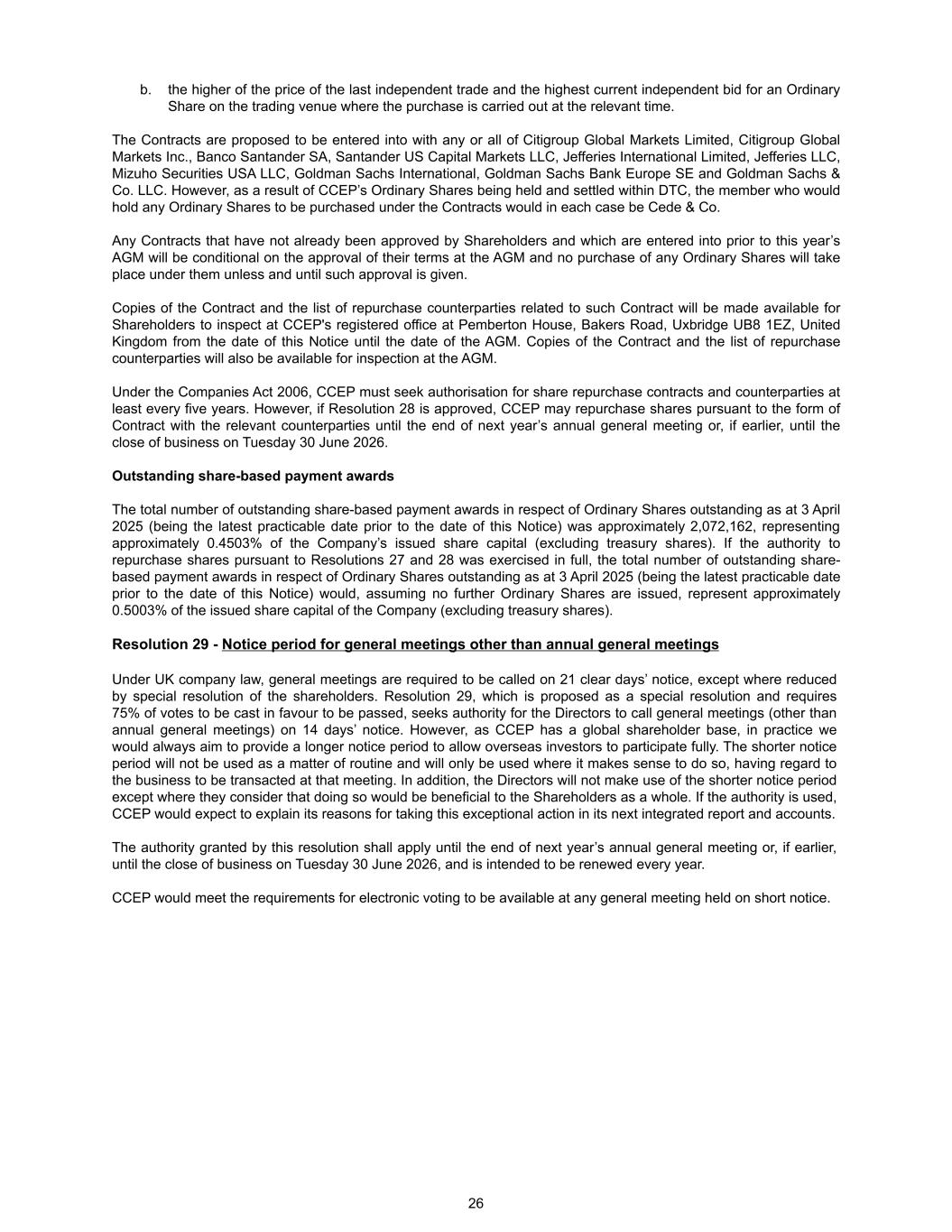 b. the higher of the price of the last independent trade and the highest current independent bid for an Ordinary Share on the trading venue where the purchase is carried out at the relevant time. The Contracts are proposed to be entered into with any or all of Citigroup Global Markets Limited, Citigroup Global Markets Inc., Banco Santander SA, Santander US Capital Markets LLC, Jefferies International Limited, Jefferies LLC, Mizuho Securities USA LLC, Goldman Sachs International, Goldman Sachs Bank Europe SE and Goldman Sachs & Co. LLC. However, as a result of CCEP’s Ordinary Shares being held and settled within DTC, the member who would hold any Ordinary Shares to be purchased under the Contracts would in each case be Cede & Co. Any Contracts that have not already been approved by Shareholders and which are entered into prior to this year’s AGM will be conditional on the approval of their terms at the AGM and no purchase of any Ordinary Shares will take place under them unless and until such approval is given. Copies of the Contract and the list of repurchase counterparties related to such Contract will be made available for Shareholders to inspect at CCEP's registered office at Pemberton House, Bakers Road, Uxbridge UB8 1EZ, United Kingdom from the date of this Notice until the date of the AGM. Copies of the Contract and the list of repurchase counterparties will also be available for inspection at the AGM. Under the Companies Act 2006, CCEP must seek authorisation for share repurchase contracts and counterparties at least every five years. However, if Resolution 28 is approved, CCEP may repurchase shares pursuant to the form of Contract with the relevant counterparties until the end of next year’s annual general meeting or, if earlier, until the close of business on Tuesday 30 June 2026. Outstanding share-based payment awards The total number of outstanding share-based payment awards in respect of Ordinary Shares outstanding as at 3 April 2025 (being the latest practicable date prior to the date of this Notice) was approximately 2,072,162, representing approximately 0.4503% of the Company’s issued share capital (excluding treasury shares). If the authority to repurchase shares pursuant to Resolutions 27 and 28 was exercised in full, the total number of outstanding share- based payment awards in respect of Ordinary Shares outstanding as at 3 April 2025 (being the latest practicable date prior to the date of this Notice) would, assuming no further Ordinary Shares are issued, represent approximately 0.5003% of the issued share capital of the Company (excluding treasury shares). Resolution 29 - Notice period for general meetings other than annual general meetings Under UK company law, general meetings are required to be called on 21 clear days’ notice, except where reduced by special resolution of the shareholders. Resolution 29, which is proposed as a special resolution and requires 75% of votes to be cast in favour to be passed, seeks authority for the Directors to call general meetings (other than annual general meetings) on 14 days’ notice. However, as CCEP has a global shareholder base, in practice we would always aim to provide a longer notice period to allow overseas investors to participate fully. The shorter notice period will not be used as a matter of routine and will only be used where it makes sense to do so, having regard to the business to be transacted at that meeting. In addition, the Directors will not make use of the shorter notice period except where they consider that doing so would be beneficial to the Shareholders as a whole. If the authority is used, CCEP would expect to explain its reasons for taking this exceptional action in its next integrated report and accounts. The authority granted by this resolution shall apply until the end of next year’s annual general meeting or, if earlier, until the close of business on Tuesday 30 June 2026, and is intended to be renewed every year. CCEP would meet the requirements for electronic voting to be available at any general meeting held on short notice. 26