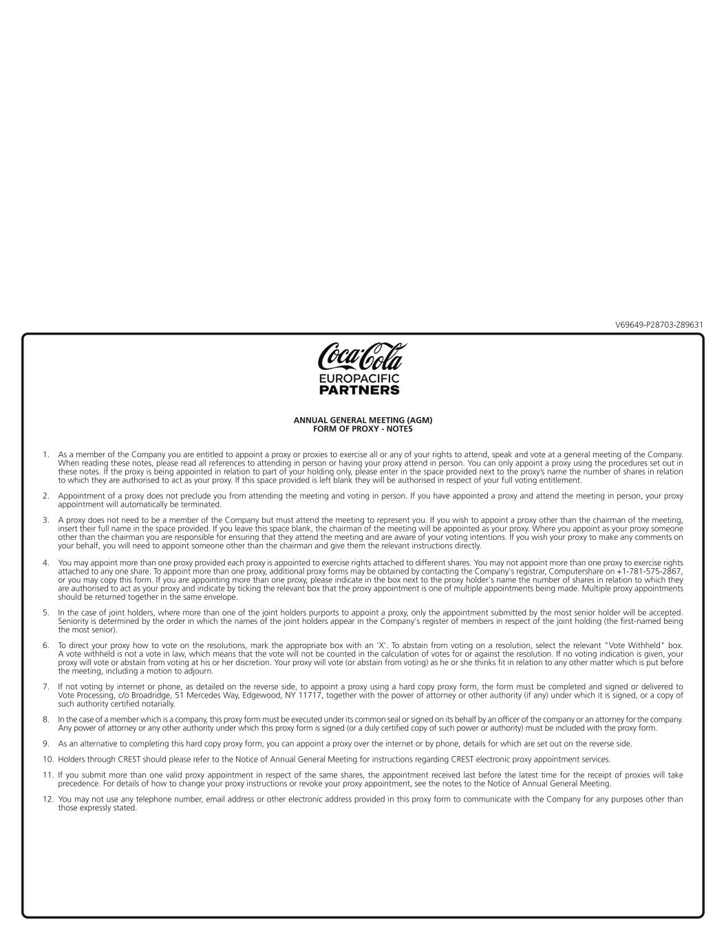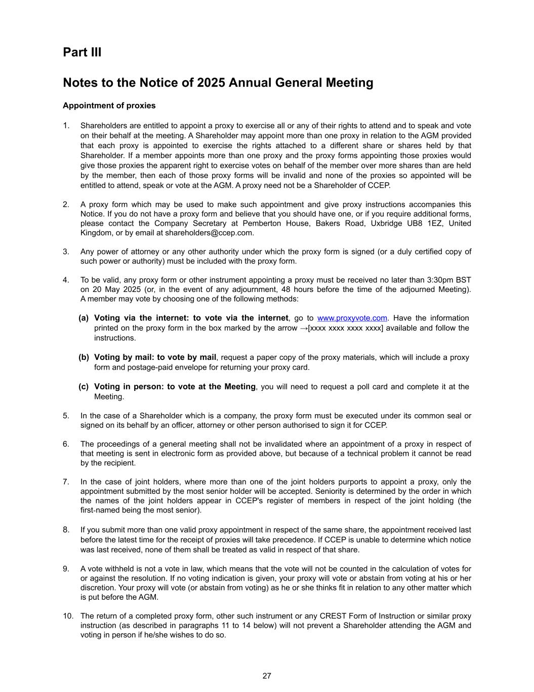 Part III Notes to the Notice of 2025 Annual General Meeting Appointment of proxies 1. Shareholders are entitled to appoint a proxy to exercise all or any of their rights to attend and to speak and vote on their behalf at the meeting. A Shareholder may appoint more than one proxy in relation to the AGM provided that each proxy is appointed to exercise the rights attached to a different share or shares held by that Shareholder. If a member appoints more than one proxy and the proxy forms appointing those proxies would give those proxies the apparent right to exercise votes on behalf of the member over more shares than are held by the member, then each of those proxy forms will be invalid and none of the proxies so appointed will be entitled to attend, speak or vote at the AGM. A proxy need not be a Shareholder of CCEP. 2. A proxy form which may be used to make such appointment and give proxy instructions accompanies this Notice. If you do not have a proxy form and believe that you should have one, or if you require additional forms, please contact the Company Secretary at Pemberton House, Bakers Road, Uxbridge UB8 1EZ, United Kingdom, or by email at shareholders@ccep.com. 3. Any power of attorney or any other authority under which the proxy form is signed (or a duly certified copy of such power or authority) must be included with the proxy form. 4. To be valid, any proxy form or other instrument appointing a proxy must be received no later than 3:30pm BST on 20 May 2025 (or, in the event of any adjournment, 48 hours before the time of the adjourned Meeting). A member may vote by choosing one of the following methods: (a) Voting via the internet: to vote via the internet, go to www.proxyvote.com. Have the information printed on the proxy form in the box marked by the arrow →[xxxx xxxx xxxx xxxx] available and follow the instructions. (b) Voting by mail: to vote by mail, request a paper copy of the proxy materials, which will include a proxy form and postage-paid envelope for returning your proxy card. (c) Voting in person: to vote at the Meeting, you will need to request a poll card and complete it at the Meeting. 5. In the case of a Shareholder which is a company, the proxy form must be executed under its common seal or signed on its behalf by an officer, attorney or other person authorised to sign it for CCEP. 6. The proceedings of a general meeting shall not be invalidated where an appointment of a proxy in respect of that meeting is sent in electronic form as provided above, but because of a technical problem it cannot be read by the recipient. 7. In the case of joint holders, where more than one of the joint holders purports to appoint a proxy, only the appointment submitted by the most senior holder will be accepted. Seniority is determined by the order in which the names of the joint holders appear in CCEP's register of members in respect of the joint holding (the first-named being the most senior). 8. If you submit more than one valid proxy appointment in respect of the same share, the appointment received last before the latest time for the receipt of proxies will take precedence. If CCEP is unable to determine which notice was last received, none of them shall be treated as valid in respect of that share. 9. A vote withheld is not a vote in law, which means that the vote will not be counted in the calculation of votes for or against the resolution. If no voting indication is given, your proxy will vote or abstain from voting at his or her discretion. Your proxy will vote (or abstain from voting) as he or she thinks fit in relation to any other matter which is put before the AGM. 10. The return of a completed proxy form, other such instrument or any CREST Form of Instruction or similar proxy instruction (as described in paragraphs 11 to 14 below) will not prevent a Shareholder attending the AGM and voting in person if he/she wishes to do so. 27