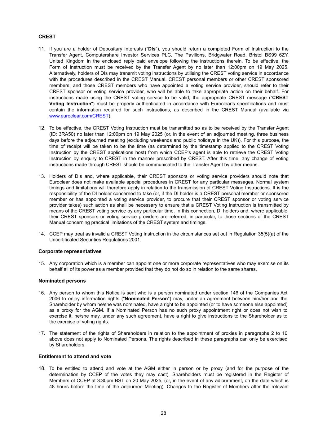 CREST 11. If you are a holder of Depositary Interests ("DIs"), you should return a completed Form of Instruction to the Transfer Agent, Computershare Investor Services PLC, The Pavilions, Bridgwater Road, Bristol BS99 6ZY, United Kingdom in the enclosed reply paid envelope following the instructions therein. To be effective, the Form of Instruction must be received by the Transfer Agent by no later than 12:00pm on 19 May 2025. Alternatively, holders of DIs may transmit voting instructions by utilising the CREST voting service in accordance with the procedures described in the CREST Manual. CREST personal members or other CREST sponsored members, and those CREST members who have appointed a voting service provider, should refer to their CREST sponsor or voting service provider, who will be able to take appropriate action on their behalf. For instructions made using the CREST voting service to be valid, the appropriate CREST message ("CREST Voting Instruction") must be properly authenticated in accordance with Euroclear's specifications and must contain the information required for such instructions, as described in the CREST Manual (available via www.euroclear.com/CREST). 12. To be effective, the CREST Voting Instruction must be transmitted so as to be received by the Transfer Agent (ID: 3RA50) no later than 12:00pm on 19 May 2025 (or, in the event of an adjourned meeting, three business days before the adjourned meeting (excluding weekends and public holidays in the UK)). For this purpose, the time of receipt will be taken to be the time (as determined by the timestamp applied to the CREST Voting Instruction by the CREST applications host) from which CCEP's agent is able to retrieve the CREST Voting Instruction by enquiry to CREST in the manner prescribed by CREST. After this time, any change of voting instructions made through CREST should be communicated to the Transfer Agent by other means. 13. Holders of DIs and, where applicable, their CREST sponsors or voting service providers should note that Euroclear does not make available special procedures in CREST for any particular messages. Normal system timings and limitations will therefore apply in relation to the transmission of CREST Voting Instructions. It is the responsibility of the DI holder concerned to take (or, if the DI holder is a CREST personal member or sponsored member or has appointed a voting service provider, to procure that their CREST sponsor or voting service provider takes) such action as shall be necessary to ensure that a CREST Voting Instruction is transmitted by means of the CREST voting service by any particular time. In this connection, DI holders and, where applicable, their CREST sponsors or voting service providers are referred, in particular, to those sections of the CREST Manual concerning practical limitations of the CREST system and timings. 14. CCEP may treat as invalid a CREST Voting Instruction in the circumstances set out in Regulation 35(5)(a) of the Uncertificated Securities Regulations 2001. Corporate representatives 15. Any corporation which is a member can appoint one or more corporate representatives who may exercise on its behalf all of its power as a member provided that they do not do so in relation to the same shares. Nominated persons 16. Any person to whom this Notice is sent who is a person nominated under section 146 of the Companies Act 2006 to enjoy information rights ("Nominated Person") may, under an agreement between him/her and the Shareholder by whom he/she was nominated, have a right to be appointed (or to have someone else appointed) as a proxy for the AGM. If a Nominated Person has no such proxy appointment right or does not wish to exercise it, he/she may, under any such agreement, have a right to give instructions to the Shareholder as to the exercise of voting rights. 17. The statement of the rights of Shareholders in relation to the appointment of proxies in paragraphs 2 to 10 above does not apply to Nominated Persons. The rights described in these paragraphs can only be exercised by Shareholders. Entitlement to attend and vote 18. To be entitled to attend and vote at the AGM either in person or by proxy (and for the purpose of the determination by CCEP of the votes they may cast), Shareholders must be registered in the Register of Members of CCEP at 3:30pm BST on 20 May 2025, (or, in the event of any adjournment, on the date which is 48 hours before the time of the adjourned Meeting). Changes to the Register of Members after the relevant 28