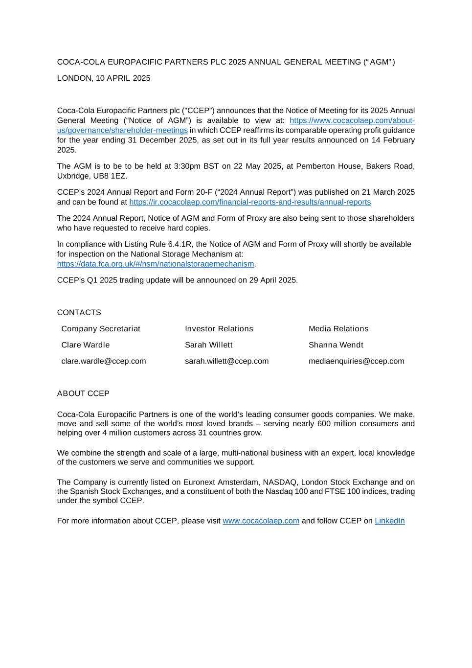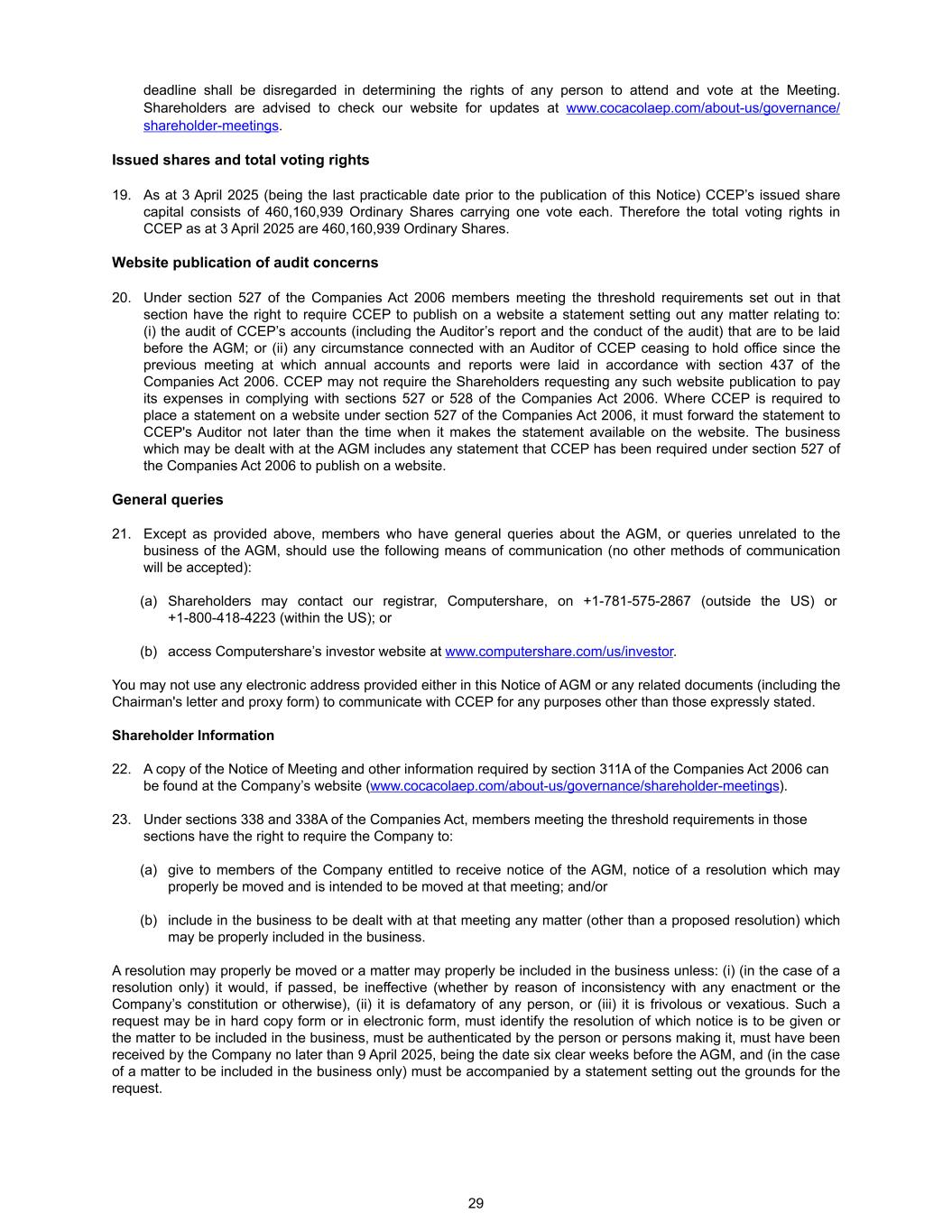 deadline shall be disregarded in determining the rights of any person to attend and vote at the Meeting. Shareholders are advised to check our website for updates at www.cocacolaep.com/about-us/governance/ shareholder-meetings. Issued shares and total voting rights 19. As at 3 April 2025 (being the last practicable date prior to the publication of this Notice) CCEP’s issued share capital consists of 460,160,939 Ordinary Shares carrying one vote each. Therefore the total voting rights in CCEP as at 3 April 2025 are 460,160,939 Ordinary Shares. Website publication of audit concerns 20. Under section 527 of the Companies Act 2006 members meeting the threshold requirements set out in that section have the right to require CCEP to publish on a website a statement setting out any matter relating to: (i) the audit of CCEP’s accounts (including the Auditor’s report and the conduct of the audit) that are to be laid before the AGM; or (ii) any circumstance connected with an Auditor of CCEP ceasing to hold office since the previous meeting at which annual accounts and reports were laid in accordance with section 437 of the Companies Act 2006. CCEP may not require the Shareholders requesting any such website publication to pay its expenses in complying with sections 527 or 528 of the Companies Act 2006. Where CCEP is required to place a statement on a website under section 527 of the Companies Act 2006, it must forward the statement to CCEP's Auditor not later than the time when it makes the statement available on the website. The business which may be dealt with at the AGM includes any statement that CCEP has been required under section 527 of the Companies Act 2006 to publish on a website. General queries 21. Except as provided above, members who have general queries about the AGM, or queries unrelated to the business of the AGM, should use the following means of communication (no other methods of communication will be accepted): (a) Shareholders may contact our registrar, Computershare, on +1-781-575-2867 (outside the US) or +1-800-418-4223 (within the US); or (b) access Computershare’s investor website at www.computershare.com/us/investor. You may not use any electronic address provided either in this Notice of AGM or any related documents (including the Chairman's letter and proxy form) to communicate with CCEP for any purposes other than those expressly stated. Shareholder Information 22. A copy of the Notice of Meeting and other information required by section 311A of the Companies Act 2006 can be found at the Company’s website (www.cocacolaep.com/about-us/governance/shareholder-meetings). 23. Under sections 338 and 338A of the Companies Act, members meeting the threshold requirements in those sections have the right to require the Company to: (a) give to members of the Company entitled to receive notice of the AGM, notice of a resolution which may properly be moved and is intended to be moved at that meeting; and/or (b) include in the business to be dealt with at that meeting any matter (other than a proposed resolution) which may be properly included in the business. A resolution may properly be moved or a matter may properly be included in the business unless: (i) (in the case of a resolution only) it would, if passed, be ineffective (whether by reason of inconsistency with any enactment or the Company’s constitution or otherwise), (ii) it is defamatory of any person, or (iii) it is frivolous or vexatious. Such a request may be in hard copy form or in electronic form, must identify the resolution of which notice is to be given or the matter to be included in the business, must be authenticated by the person or persons making it, must have been received by the Company no later than 9 April 2025, being the date six clear weeks before the AGM, and (in the case of a matter to be included in the business only) must be accompanied by a statement setting out the grounds for the request. 29
