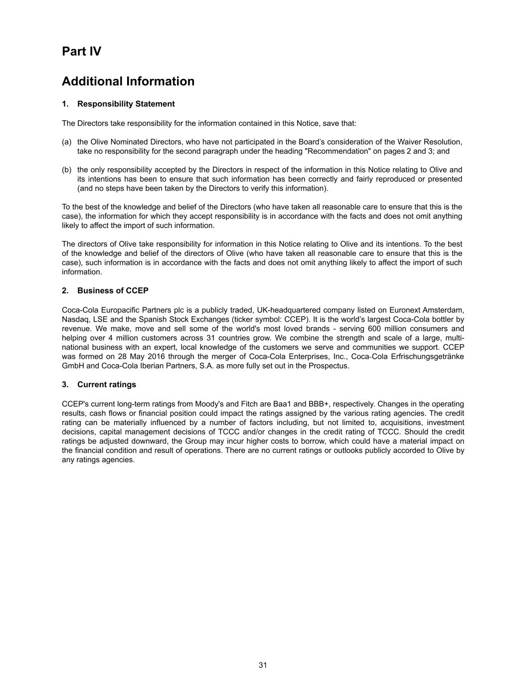 Part IV Additional Information 1. Responsibility Statement The Directors take responsibility for the information contained in this Notice, save that: (a) the Olive Nominated Directors, who have not participated in the Board’s consideration of the Waiver Resolution, take no responsibility for the second paragraph under the heading "Recommendation" on pages 2 and 3; and (b) the only responsibility accepted by the Directors in respect of the information in this Notice relating to Olive and its intentions has been to ensure that such information has been correctly and fairly reproduced or presented (and no steps have been taken by the Directors to verify this information). To the best of the knowledge and belief of the Directors (who have taken all reasonable care to ensure that this is the case), the information for which they accept responsibility is in accordance with the facts and does not omit anything likely to affect the import of such information. The directors of Olive take responsibility for information in this Notice relating to Olive and its intentions. To the best of the knowledge and belief of the directors of Olive (who have taken all reasonable care to ensure that this is the case), such information is in accordance with the facts and does not omit anything likely to affect the import of such information. 2. Business of CCEP Coca-Cola Europacific Partners plc is a publicly traded, UK-headquartered company listed on Euronext Amsterdam, Nasdaq, LSE and the Spanish Stock Exchanges (ticker symbol: CCEP). It is the world’s largest Coca-Cola bottler by revenue. We make, move and sell some of the world's most loved brands - serving 600 million consumers and helping over 4 million customers across 31 countries grow. We combine the strength and scale of a large, multi- national business with an expert, local knowledge of the customers we serve and communities we support. CCEP was formed on 28 May 2016 through the merger of Coca-Cola Enterprises, Inc., Coca-Cola Erfrischungsgetränke GmbH and Coca-Cola Iberian Partners, S.A. as more fully set out in the Prospectus. 3. Current ratings CCEP's current long-term ratings from Moody's and Fitch are Baa1 and BBB+, respectively. Changes in the operating results, cash flows or financial position could impact the ratings assigned by the various rating agencies. The credit rating can be materially influenced by a number of factors including, but not limited to, acquisitions, investment decisions, capital management decisions of TCCC and/or changes in the credit rating of TCCC. Should the credit ratings be adjusted downward, the Group may incur higher costs to borrow, which could have a material impact on the financial condition and result of operations. There are no current ratings or outlooks publicly accorded to Olive by any ratings agencies. 31