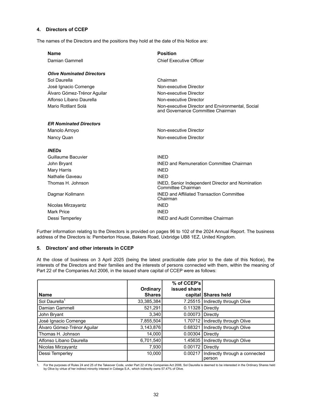 4. Directors of CCEP The names of the Directors and the positions they hold at the date of this Notice are: Name Position Damian Gammell Chief Executive Officer Olive Nominated Directors Sol Daurella Chairman José Ignacio Comenge Non-executive Director Álvaro Gómez-Trénor Aguilar Non-executive Director Alfonso Líbano Daurella Non-executive Director Mario Rotllant Solá Non-executive Director and Environmental, Social and Governance Committee Chairman ER Nominated Directors Manolo Arroyo Non-executive Director Nancy Quan Non-executive Director INEDs Guillaume Bacuvier INED John Bryant INED and Remuneration Committee Chairman Mary Harris INED Nathalie Gaveau INED Thomas H. Johnson INED, Senior Independent Director and Nomination Committee Chairman Dagmar Kollmann INED and Affiliated Transaction Committee Chairman Nicolas Mirzayantz INED Mark Price INED Dessi Temperley INED and Audit Committee Chairman Further information relating to the Directors is provided on pages 96 to 102 of the 2024 Annual Report. The business address of the Directors is: Pemberton House, Bakers Road, Uxbridge UB8 1EZ, United Kingdom. 5. Directors' and other interests in CCEP At the close of business on 3 April 2025 (being the latest practicable date prior to the date of this Notice), the interests of the Directors and their families and the interests of persons connected with them, within the meaning of Part 22 of the Companies Act 2006, in the issued share capital of CCEP were as follows: Name Ordinary Shares % of CCEP's issued share capital Shares held Sol Daurella1 33,385,384 7.25515 Indirectly through Olive Damian Gammell 521,291 0.11328 Directly John Bryant 3,340 0.00073 Directly José Ignacio Comenge 7,855,504 1.70712 Indirectly through Olive Álvaro Gómez-Trénor Aguilar 3,143,876 0.68321 Indirectly through Olive Thomas H. Johnson 14,000 0.00304 Directly Alfonso Líbano Daurella 6,701,540 1.45635 Indirectly through Olive Nicolas Mirzayantz 7,930 0.00172 Directly Dessi Temperley 10,000 0.00217 Indirectly through a connected person 1. For the purposes of Rules 24 and 25 of the Takeover Code, under Part 22 of the Companies Act 2006, Sol Daurella is deemed to be interested in the Ordinary Shares held by Olive by virtue of her indirect minority interest in Cobega S.A., which indirectly owns 57.47% of Olive. 32