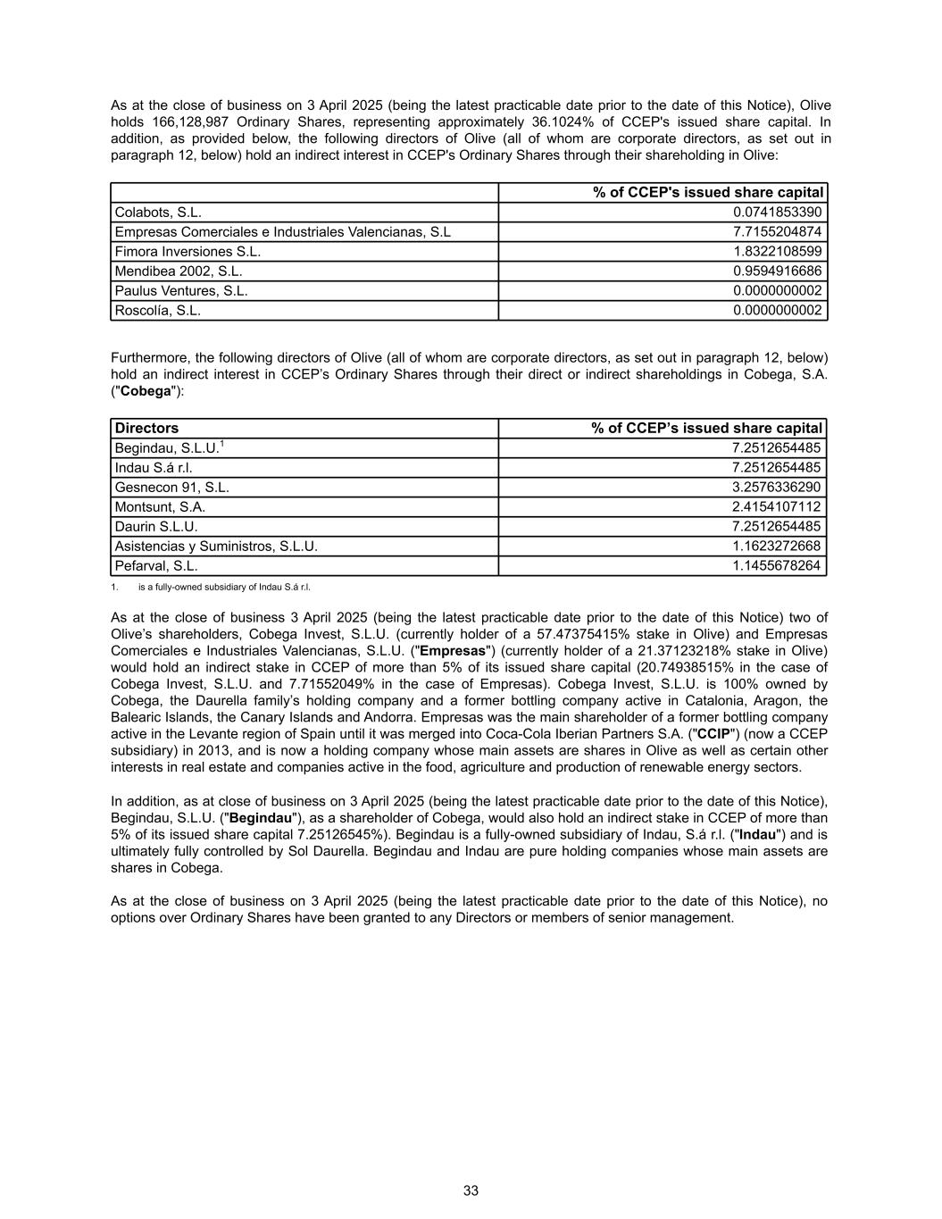 As at the close of business on 3 April 2025 (being the latest practicable date prior to the date of this Notice), Olive holds 166,128,987 Ordinary Shares, representing approximately 36.1024% of CCEP's issued share capital. In addition, as provided below, the following directors of Olive (all of whom are corporate directors, as set out in paragraph 12, below) hold an indirect interest in CCEP's Ordinary Shares through their shareholding in Olive: % of CCEP's issued share capital Colabots, S.L. 0.0741853390 Empresas Comerciales e Industriales Valencianas, S.L 7.7155204874 Fimora Inversiones S.L. 1.8322108599 Mendibea 2002, S.L. 0.9594916686 Paulus Ventures, S.L. 0.0000000002 Roscolía, S.L. 0.0000000002 Furthermore, the following directors of Olive (all of whom are corporate directors, as set out in paragraph 12, below) hold an indirect interest in CCEP’s Ordinary Shares through their direct or indirect shareholdings in Cobega, S.A. ("Cobega"): Directors % of CCEP’s issued share capital Begindau, S.L.U.1 7.2512654485 Indau S.á r.l. 7.2512654485 Gesnecon 91, S.L. 3.2576336290 Montsunt, S.A. 2.4154107112 Daurin S.L.U. 7.2512654485 Asistencias y Suministros, S.L.U. 1.1623272668 Pefarval, S.L. 1.1455678264 1. is a fully-owned subsidiary of Indau S.á r.l. As at the close of business 3 April 2025 (being the latest practicable date prior to the date of this Notice) two of Olive’s shareholders, Cobega Invest, S.L.U. (currently holder of a 57.47375415% stake in Olive) and Empresas Comerciales e Industriales Valencianas, S.L.U. ("Empresas") (currently holder of a 21.37123218% stake in Olive) would hold an indirect stake in CCEP of more than 5% of its issued share capital (20.74938515% in the case of Cobega Invest, S.L.U. and 7.71552049% in the case of Empresas). Cobega Invest, S.L.U. is 100% owned by Cobega, the Daurella family’s holding company and a former bottling company active in Catalonia, Aragon, the Balearic Islands, the Canary Islands and Andorra. Empresas was the main shareholder of a former bottling company active in the Levante region of Spain until it was merged into Coca-Cola Iberian Partners S.A. ("CCIP") (now a CCEP subsidiary) in 2013, and is now a holding company whose main assets are shares in Olive as well as certain other interests in real estate and companies active in the food, agriculture and production of renewable energy sectors. In addition, as at close of business on 3 April 2025 (being the latest practicable date prior to the date of this Notice), Begindau, S.L.U. ("Begindau"), as a shareholder of Cobega, would also hold an indirect stake in CCEP of more than 5% of its issued share capital 7.25126545%). Begindau is a fully-owned subsidiary of Indau, S.á r.l. ("Indau") and is ultimately fully controlled by Sol Daurella. Begindau and Indau are pure holding companies whose main assets are shares in Cobega. As at the close of business on 3 April 2025 (being the latest practicable date prior to the date of this Notice), no options over Ordinary Shares have been granted to any Directors or members of senior management. 33