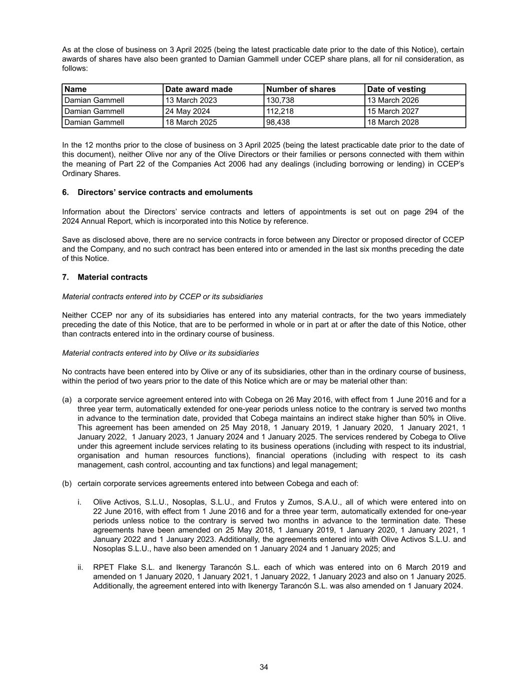As at the close of business on 3 April 2025 (being the latest practicable date prior to the date of this Notice), certain awards of shares have also been granted to Damian Gammell under CCEP share plans, all for nil consideration, as follows: Name Date award made Number of shares Date of vesting Damian Gammell 13 March 2023 130,738 13 March 2026 Damian Gammell 24 May 2024 112,218 15 March 2027 Damian Gammell 18 March 2025 98,438 18 March 2028 In the 12 months prior to the close of business on 3 April 2025 (being the latest practicable date prior to the date of this document), neither Olive nor any of the Olive Directors or their families or persons connected with them within the meaning of Part 22 of the Companies Act 2006 had any dealings (including borrowing or lending) in CCEP’s Ordinary Shares. 6. Directors’ service contracts and emoluments Information about the Directors’ service contracts and letters of appointments is set out on page 294 of the 2024 Annual Report, which is incorporated into this Notice by reference. Save as disclosed above, there are no service contracts in force between any Director or proposed director of CCEP and the Company, and no such contract has been entered into or amended in the last six months preceding the date of this Notice. 7. Material contracts Material contracts entered into by CCEP or its subsidiaries Neither CCEP nor any of its subsidiaries has entered into any material contracts, for the two years immediately preceding the date of this Notice, that are to be performed in whole or in part at or after the date of this Notice, other than contracts entered into in the ordinary course of business. Material contracts entered into by Olive or its subsidiaries No contracts have been entered into by Olive or any of its subsidiaries, other than in the ordinary course of business, within the period of two years prior to the date of this Notice which are or may be material other than: (a) a corporate service agreement entered into with Cobega on 26 May 2016, with effect from 1 June 2016 and for a three year term, automatically extended for one-year periods unless notice to the contrary is served two months in advance to the termination date, provided that Cobega maintains an indirect stake higher than 50% in Olive. This agreement has been amended on 25 May 2018, 1 January 2019, 1 January 2020, 1 January 2021, 1 January 2022, 1 January 2023, 1 January 2024 and 1 January 2025. The services rendered by Cobega to Olive under this agreement include services relating to its business operations (including with respect to its industrial, organisation and human resources functions), financial operations (including with respect to its cash management, cash control, accounting and tax functions) and legal management; (b) certain corporate services agreements entered into between Cobega and each of: i. Olive Activos, S.L.U., Nosoplas, S.L.U., and Frutos y Zumos, S.A.U., all of which were entered into on 22 June 2016, with effect from 1 June 2016 and for a three year term, automatically extended for one-year periods unless notice to the contrary is served two months in advance to the termination date. These agreements have been amended on 25 May 2018, 1 January 2019, 1 January 2020, 1 January 2021, 1 January 2022 and 1 January 2023. Additionally, the agreements entered into with Olive Activos S.L.U. and Nosoplas S.L.U., have also been amended on 1 January 2024 and 1 January 2025; and ii. RPET Flake S.L. and Ikenergy Tarancón S.L. each of which was entered into on 6 March 2019 and amended on 1 January 2020, 1 January 2021, 1 January 2022, 1 January 2023 and also on 1 January 2025. Additionally, the agreement entered into with Ikenergy Tarancón S.L. was also amended on 1 January 2024. 34