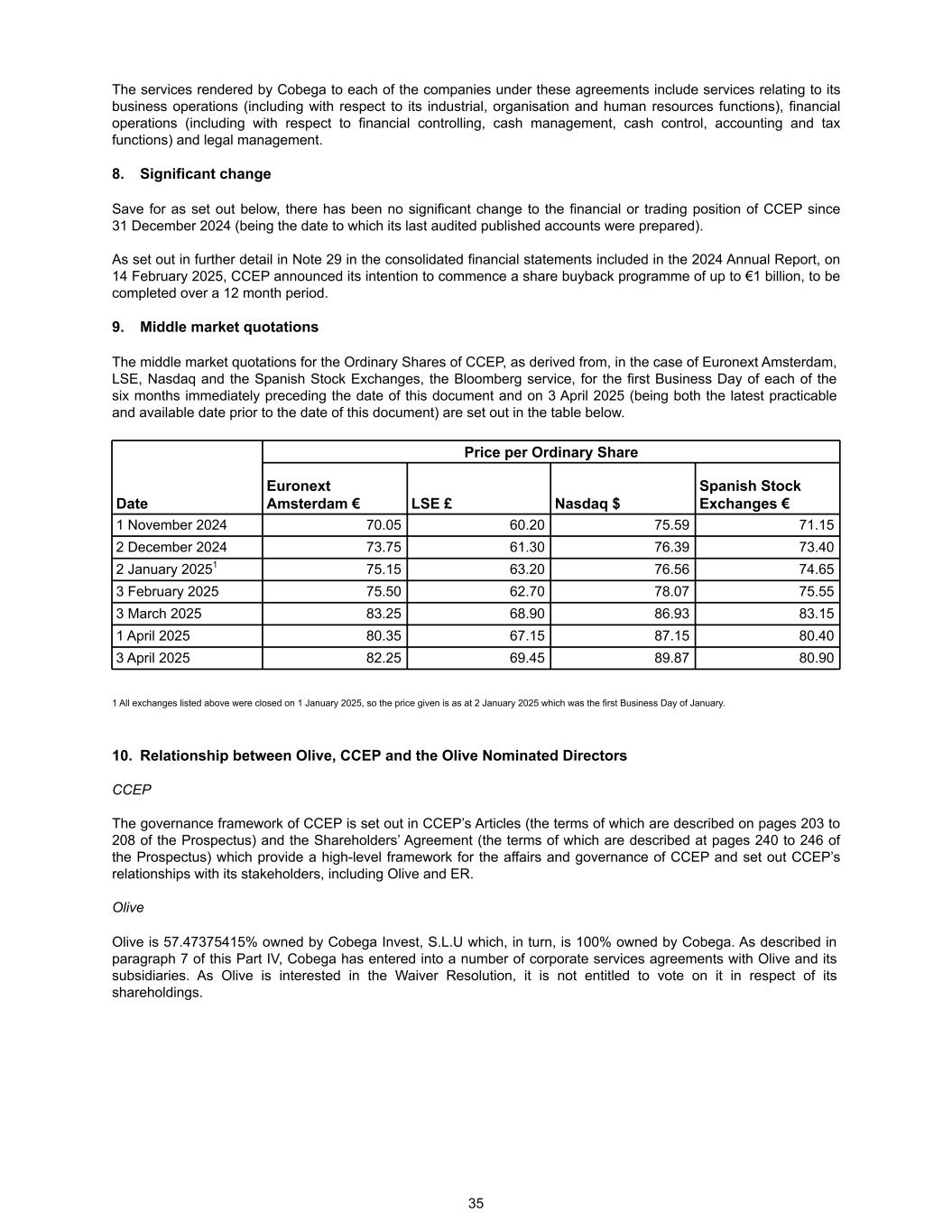 The services rendered by Cobega to each of the companies under these agreements include services relating to its business operations (including with respect to its industrial, organisation and human resources functions), financial operations (including with respect to financial controlling, cash management, cash control, accounting and tax functions) and legal management. 8. Significant change Save for as set out below, there has been no significant change to the financial or trading position of CCEP since 31 December 2024 (being the date to which its last audited published accounts were prepared). As set out in further detail in Note 29 in the consolidated financial statements included in the 2024 Annual Report, on 14 February 2025, CCEP announced its intention to commence a share buyback programme of up to €1 billion, to be completed over a 12 month period. 9. Middle market quotations The middle market quotations for the Ordinary Shares of CCEP, as derived from, in the case of Euronext Amsterdam, LSE, Nasdaq and the Spanish Stock Exchanges, the Bloomberg service, for the first Business Day of each of the six months immediately preceding the date of this document and on 3 April 2025 (being both the latest practicable and available date prior to the date of this document) are set out in the table below. Date Price per Ordinary Share Euronext Amsterdam € LSE £ Nasdaq $ Spanish Stock Exchanges € 1 November 2024 70.05 60.20 75.59 71.15 2 December 2024 73.75 61.30 76.39 73.40 2 January 20251 75.15 63.20 76.56 74.65 3 February 2025 75.50 62.70 78.07 75.55 3 March 2025 83.25 68.90 86.93 83.15 1 April 2025 80.35 67.15 87.15 80.40 3 April 2025 82.25 69.45 89.87 80.90 1 All exchanges listed above were closed on 1 January 2025, so the price given is as at 2 January 2025 which was the first Business Day of January. 10. Relationship between Olive, CCEP and the Olive Nominated Directors CCEP The governance framework of CCEP is set out in CCEP’s Articles (the terms of which are described on pages 203 to 208 of the Prospectus) and the Shareholders’ Agreement (the terms of which are described at pages 240 to 246 of the Prospectus) which provide a high-level framework for the affairs and governance of CCEP and set out CCEP’s relationships with its stakeholders, including Olive and ER. Olive Olive is 57.47375415% owned by Cobega Invest, S.L.U which, in turn, is 100% owned by Cobega. As described in paragraph 7 of this Part IV, Cobega has entered into a number of corporate services agreements with Olive and its subsidiaries. As Olive is interested in the Waiver Resolution, it is not entitled to vote on it in respect of its shareholdings. 35