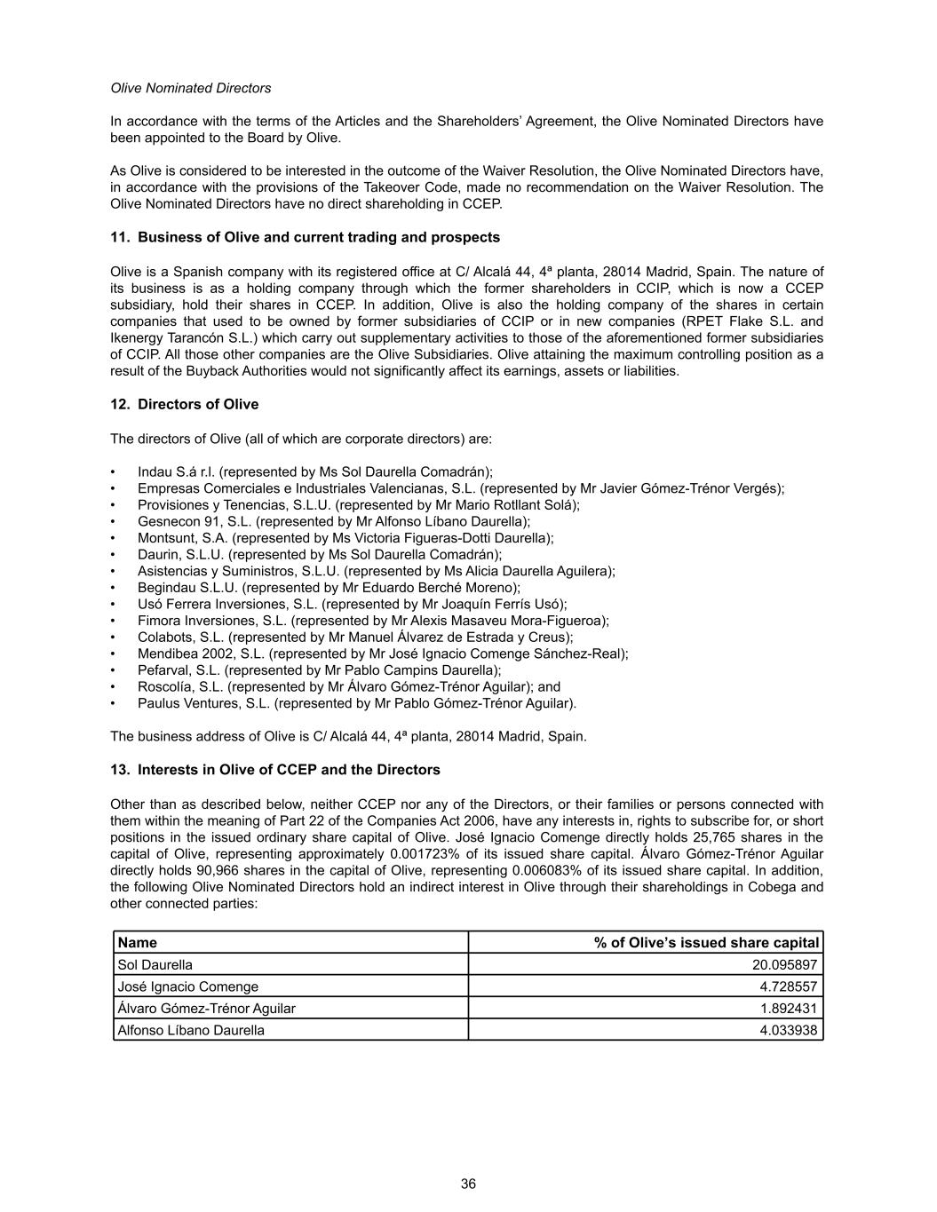 Olive Nominated Directors In accordance with the terms of the Articles and the Shareholders’ Agreement, the Olive Nominated Directors have been appointed to the Board by Olive. As Olive is considered to be interested in the outcome of the Waiver Resolution, the Olive Nominated Directors have, in accordance with the provisions of the Takeover Code, made no recommendation on the Waiver Resolution. The Olive Nominated Directors have no direct shareholding in CCEP. 11. Business of Olive and current trading and prospects Olive is a Spanish company with its registered office at C/ Alcalá 44, 4ª planta, 28014 Madrid, Spain. The nature of its business is as a holding company through which the former shareholders in CCIP, which is now a CCEP subsidiary, hold their shares in CCEP. In addition, Olive is also the holding company of the shares in certain companies that used to be owned by former subsidiaries of CCIP or in new companies (RPET Flake S.L. and Ikenergy Tarancón S.L.) which carry out supplementary activities to those of the aforementioned former subsidiaries of CCIP. All those other companies are the Olive Subsidiaries. Olive attaining the maximum controlling position as a result of the Buyback Authorities would not significantly affect its earnings, assets or liabilities. 12. Directors of Olive The directors of Olive (all of which are corporate directors) are: • Indau S.á r.l. (represented by Ms Sol Daurella Comadrán); • Empresas Comerciales e Industriales Valencianas, S.L. (represented by Mr Javier Gómez-Trénor Vergés); • Provisiones y Tenencias, S.L.U. (represented by Mr Mario Rotllant Solá); • Gesnecon 91, S.L. (represented by Mr Alfonso Líbano Daurella); • Montsunt, S.A. (represented by Ms Victoria Figueras-Dotti Daurella); • Daurin, S.L.U. (represented by Ms Sol Daurella Comadrán); • Asistencias y Suministros, S.L.U. (represented by Ms Alicia Daurella Aguilera); • Begindau S.L.U. (represented by Mr Eduardo Berché Moreno); • Usó Ferrera Inversiones, S.L. (represented by Mr Joaquín Ferrís Usó); • Fimora Inversiones, S.L. (represented by Mr Alexis Masaveu Mora-Figueroa); • Colabots, S.L. (represented by Mr Manuel Álvarez de Estrada y Creus); • Mendibea 2002, S.L. (represented by Mr José Ignacio Comenge Sánchez-Real); • Pefarval, S.L. (represented by Mr Pablo Campins Daurella); • Roscolía, S.L. (represented by Mr Álvaro Gómez-Trénor Aguilar); and • Paulus Ventures, S.L. (represented by Mr Pablo Gómez-Trénor Aguilar). The business address of Olive is C/ Alcalá 44, 4ª planta, 28014 Madrid, Spain. 13. Interests in Olive of CCEP and the Directors Other than as described below, neither CCEP nor any of the Directors, or their families or persons connected with them within the meaning of Part 22 of the Companies Act 2006, have any interests in, rights to subscribe for, or short positions in the issued ordinary share capital of Olive. José Ignacio Comenge directly holds 25,765 shares in the capital of Olive, representing approximately 0.001723% of its issued share capital. Álvaro Gómez-Trénor Aguilar directly holds 90,966 shares in the capital of Olive, representing 0.006083% of its issued share capital. In addition, the following Olive Nominated Directors hold an indirect interest in Olive through their shareholdings in Cobega and other connected parties: Name % of Olive’s issued share capital Sol Daurella 20.095897 José Ignacio Comenge 4.728557 Álvaro Gómez-Trénor Aguilar 1.892431 Alfonso Líbano Daurella 4.033938 36