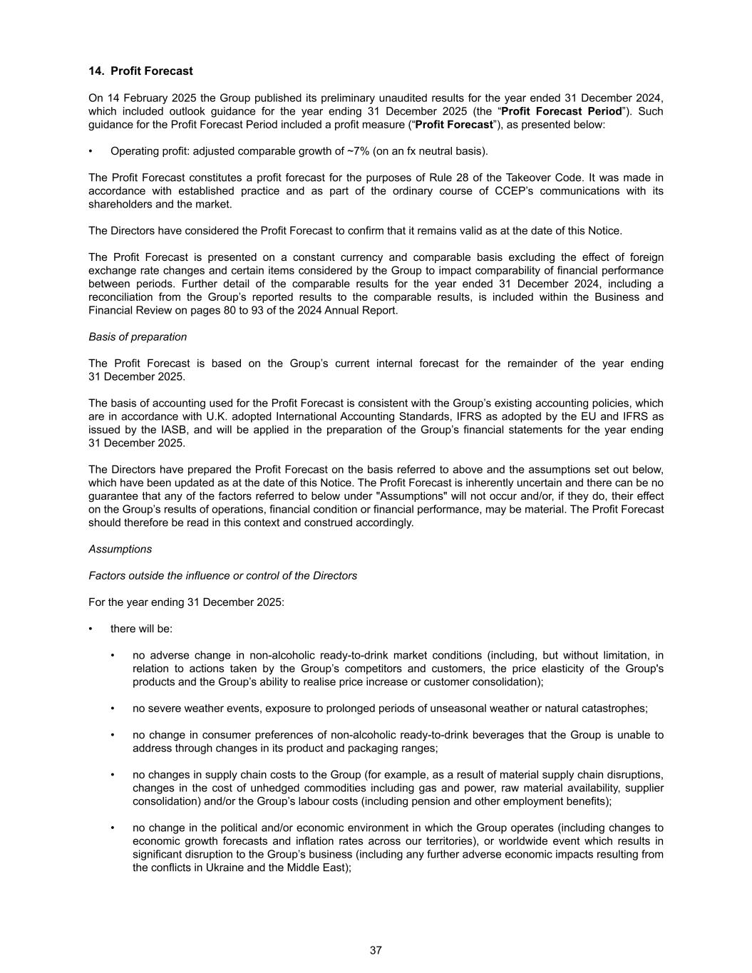 14. Profit Forecast On 14 February 2025 the Group published its preliminary unaudited results for the year ended 31 December 2024, which included outlook guidance for the year ending 31 December 2025 (the “Profit Forecast Period”). Such guidance for the Profit Forecast Period included a profit measure (“Profit Forecast”), as presented below: • Operating profit: adjusted comparable growth of ~7% (on an fx neutral basis). The Profit Forecast constitutes a profit forecast for the purposes of Rule 28 of the Takeover Code. It was made in accordance with established practice and as part of the ordinary course of CCEP’s communications with its shareholders and the market. The Directors have considered the Profit Forecast to confirm that it remains valid as at the date of this Notice. The Profit Forecast is presented on a constant currency and comparable basis excluding the effect of foreign exchange rate changes and certain items considered by the Group to impact comparability of financial performance between periods. Further detail of the comparable results for the year ended 31 December 2024, including a reconciliation from the Group’s reported results to the comparable results, is included within the Business and Financial Review on pages 80 to 93 of the 2024 Annual Report. Basis of preparation The Profit Forecast is based on the Group’s current internal forecast for the remainder of the year ending 31 December 2025. The basis of accounting used for the Profit Forecast is consistent with the Group’s existing accounting policies, which are in accordance with U.K. adopted International Accounting Standards, IFRS as adopted by the EU and IFRS as issued by the IASB, and will be applied in the preparation of the Group’s financial statements for the year ending 31 December 2025. The Directors have prepared the Profit Forecast on the basis referred to above and the assumptions set out below, which have been updated as at the date of this Notice. The Profit Forecast is inherently uncertain and there can be no guarantee that any of the factors referred to below under "Assumptions" will not occur and/or, if they do, their effect on the Group’s results of operations, financial condition or financial performance, may be material. The Profit Forecast should therefore be read in this context and construed accordingly. Assumptions Factors outside the influence or control of the Directors For the year ending 31 December 2025: • there will be: • no adverse change in non-alcoholic ready-to-drink market conditions (including, but without limitation, in relation to actions taken by the Group’s competitors and customers, the price elasticity of the Group's products and the Group’s ability to realise price increase or customer consolidation); • no severe weather events, exposure to prolonged periods of unseasonal weather or natural catastrophes; • no change in consumer preferences of non-alcoholic ready-to-drink beverages that the Group is unable to address through changes in its product and packaging ranges; • no changes in supply chain costs to the Group (for example, as a result of material supply chain disruptions, changes in the cost of unhedged commodities including gas and power, raw material availability, supplier consolidation) and/or the Group’s labour costs (including pension and other employment benefits); • no change in the political and/or economic environment in which the Group operates (including changes to economic growth forecasts and inflation rates across our territories), or worldwide event which results in significant disruption to the Group’s business (including any further adverse economic impacts resulting from the conflicts in Ukraine and the Middle East); 37