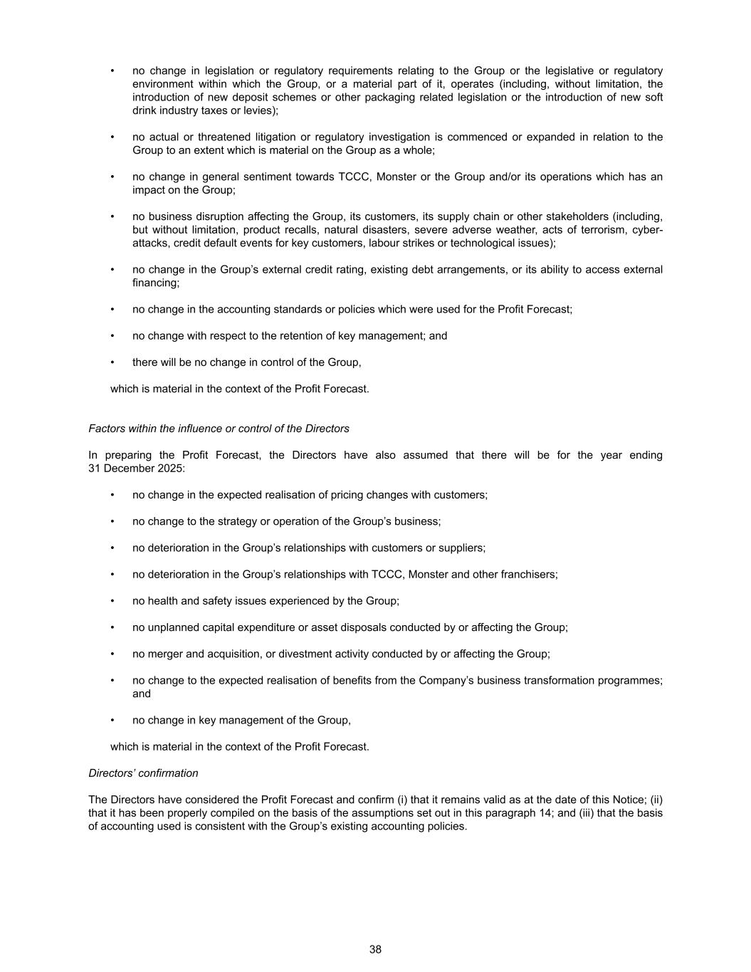 • no change in legislation or regulatory requirements relating to the Group or the legislative or regulatory environment within which the Group, or a material part of it, operates (including, without limitation, the introduction of new deposit schemes or other packaging related legislation or the introduction of new soft drink industry taxes or levies); • no actual or threatened litigation or regulatory investigation is commenced or expanded in relation to the Group to an extent which is material on the Group as a whole; • no change in general sentiment towards TCCC, Monster or the Group and/or its operations which has an impact on the Group; • no business disruption affecting the Group, its customers, its supply chain or other stakeholders (including, but without limitation, product recalls, natural disasters, severe adverse weather, acts of terrorism, cyber- attacks, credit default events for key customers, labour strikes or technological issues); • no change in the Group’s external credit rating, existing debt arrangements, or its ability to access external financing; • no change in the accounting standards or policies which were used for the Profit Forecast; • no change with respect to the retention of key management; and • there will be no change in control of the Group, which is material in the context of the Profit Forecast. Factors within the influence or control of the Directors In preparing the Profit Forecast, the Directors have also assumed that there will be for the year ending 31 December 2025: • no change in the expected realisation of pricing changes with customers; • no change to the strategy or operation of the Group’s business; • no deterioration in the Group’s relationships with customers or suppliers; • no deterioration in the Group’s relationships with TCCC, Monster and other franchisers; • no health and safety issues experienced by the Group; • no unplanned capital expenditure or asset disposals conducted by or affecting the Group; • no merger and acquisition, or divestment activity conducted by or affecting the Group; • no change to the expected realisation of benefits from the Company’s business transformation programmes; and • no change in key management of the Group, which is material in the context of the Profit Forecast. Directors’ confirmation The Directors have considered the Profit Forecast and confirm (i) that it remains valid as at the date of this Notice; (ii) that it has been properly compiled on the basis of the assumptions set out in this paragraph 14; and (iii) that the basis of accounting used is consistent with the Group’s existing accounting policies. 38