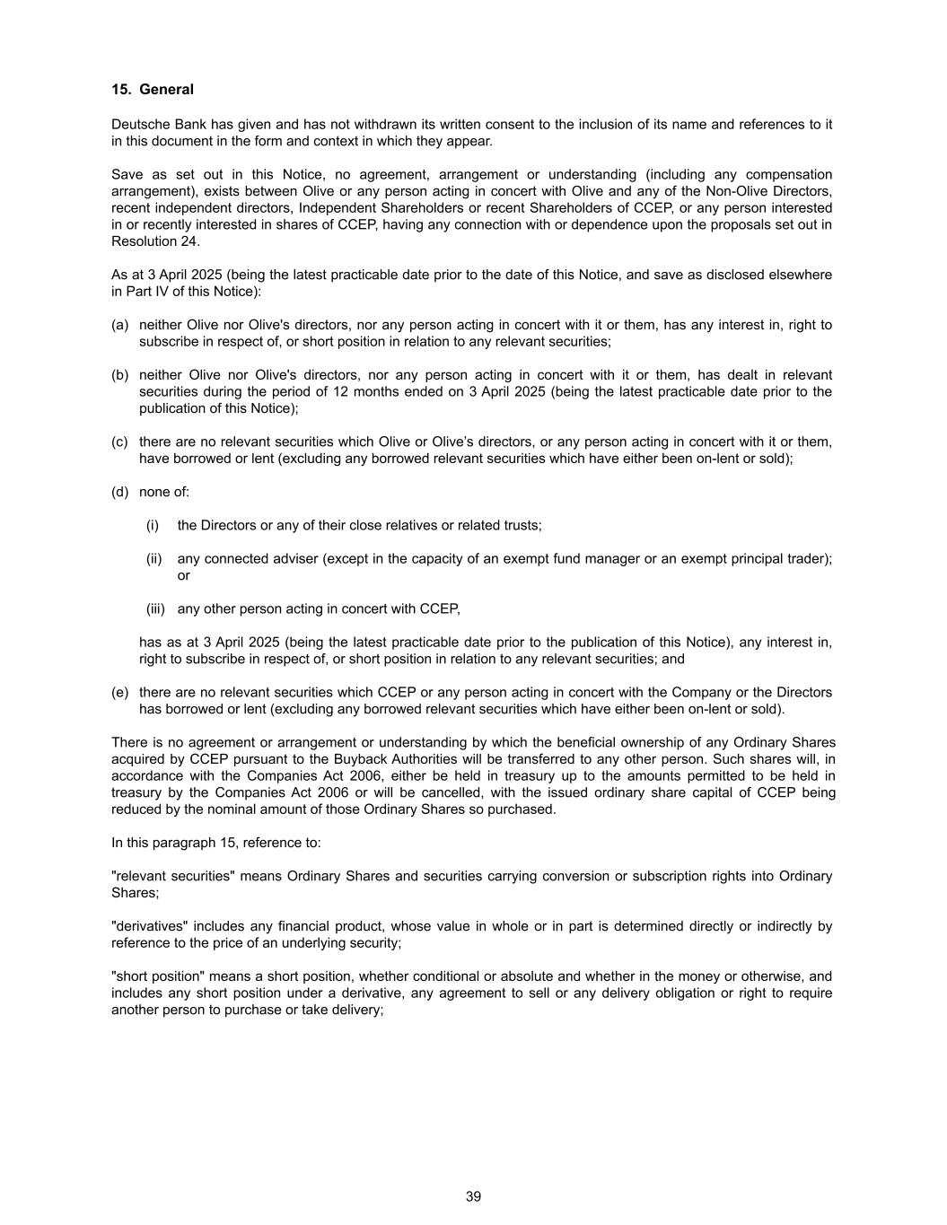 15. General Deutsche Bank has given and has not withdrawn its written consent to the inclusion of its name and references to it in this document in the form and context in which they appear. Save as set out in this Notice, no agreement, arrangement or understanding (including any compensation arrangement), exists between Olive or any person acting in concert with Olive and any of the Non-Olive Directors, recent independent directors, Independent Shareholders or recent Shareholders of CCEP, or any person interested in or recently interested in shares of CCEP, having any connection with or dependence upon the proposals set out in Resolution 24. As at 3 April 2025 (being the latest practicable date prior to the date of this Notice, and save as disclosed elsewhere in Part IV of this Notice): (a) neither Olive nor Olive's directors, nor any person acting in concert with it or them, has any interest in, right to subscribe in respect of, or short position in relation to any relevant securities; (b) neither Olive nor Olive's directors, nor any person acting in concert with it or them, has dealt in relevant securities during the period of 12 months ended on 3 April 2025 (being the latest practicable date prior to the publication of this Notice); (c) there are no relevant securities which Olive or Olive’s directors, or any person acting in concert with it or them, have borrowed or lent (excluding any borrowed relevant securities which have either been on-lent or sold); (d) none of: (i) the Directors or any of their close relatives or related trusts; (ii) any connected adviser (except in the capacity of an exempt fund manager or an exempt principal trader); or (iii) any other person acting in concert with CCEP, has as at 3 April 2025 (being the latest practicable date prior to the publication of this Notice), any interest in, right to subscribe in respect of, or short position in relation to any relevant securities; and (e) there are no relevant securities which CCEP or any person acting in concert with the Company or the Directors has borrowed or lent (excluding any borrowed relevant securities which have either been on-lent or sold). There is no agreement or arrangement or understanding by which the beneficial ownership of any Ordinary Shares acquired by CCEP pursuant to the Buyback Authorities will be transferred to any other person. Such shares will, in accordance with the Companies Act 2006, either be held in treasury up to the amounts permitted to be held in treasury by the Companies Act 2006 or will be cancelled, with the issued ordinary share capital of CCEP being reduced by the nominal amount of those Ordinary Shares so purchased. In this paragraph 15, reference to: "relevant securities" means Ordinary Shares and securities carrying conversion or subscription rights into Ordinary Shares; "derivatives" includes any financial product, whose value in whole or in part is determined directly or indirectly by reference to the price of an underlying security; "short position" means a short position, whether conditional or absolute and whether in the money or otherwise, and includes any short position under a derivative, any agreement to sell or any delivery obligation or right to require another person to purchase or take delivery; 39