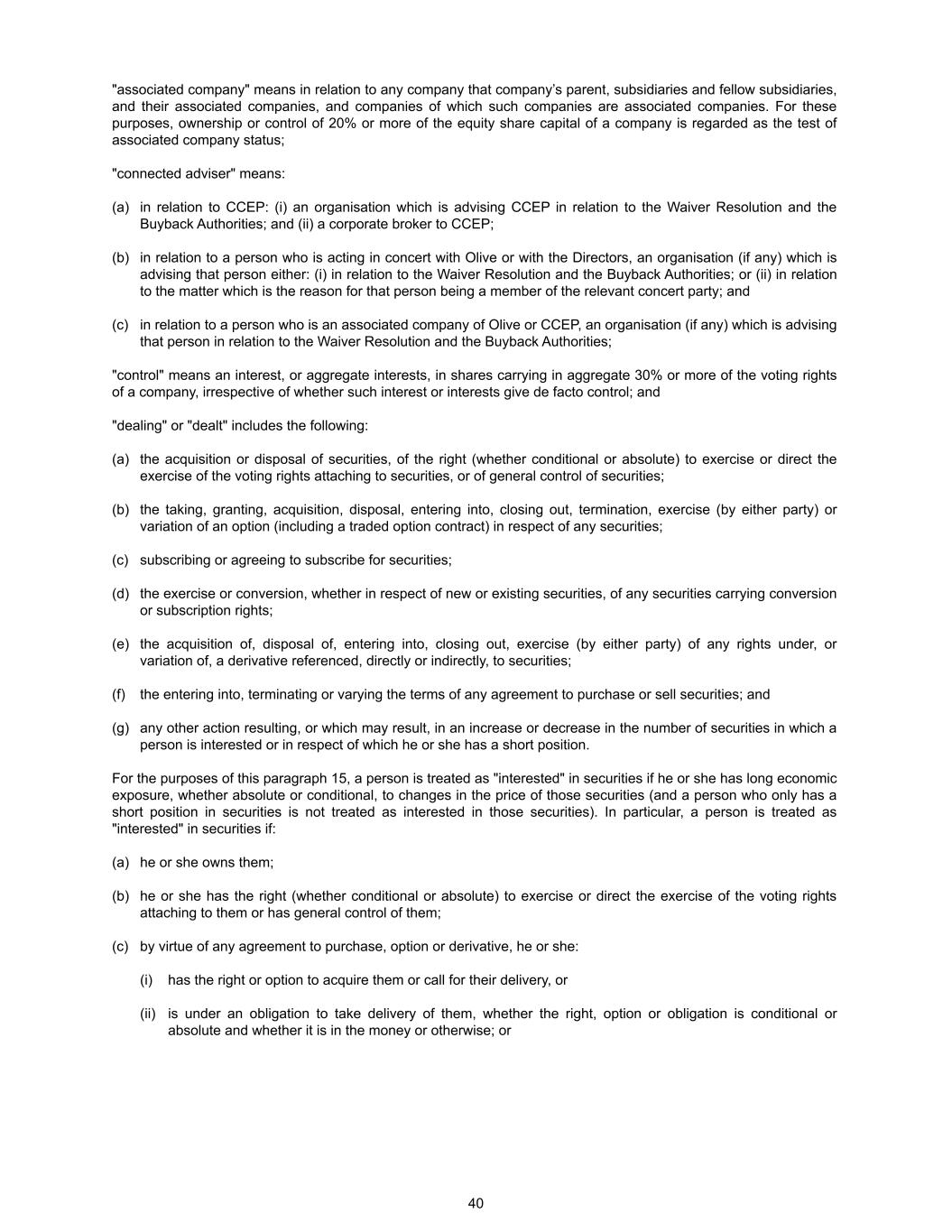 "associated company" means in relation to any company that company’s parent, subsidiaries and fellow subsidiaries, and their associated companies, and companies of which such companies are associated companies. For these purposes, ownership or control of 20% or more of the equity share capital of a company is regarded as the test of associated company status; "connected adviser" means: (a) in relation to CCEP: (i) an organisation which is advising CCEP in relation to the Waiver Resolution and the Buyback Authorities; and (ii) a corporate broker to CCEP; (b) in relation to a person who is acting in concert with Olive or with the Directors, an organisation (if any) which is advising that person either: (i) in relation to the Waiver Resolution and the Buyback Authorities; or (ii) in relation to the matter which is the reason for that person being a member of the relevant concert party; and (c) in relation to a person who is an associated company of Olive or CCEP, an organisation (if any) which is advising that person in relation to the Waiver Resolution and the Buyback Authorities; "control" means an interest, or aggregate interests, in shares carrying in aggregate 30% or more of the voting rights of a company, irrespective of whether such interest or interests give de facto control; and "dealing" or "dealt" includes the following: (a) the acquisition or disposal of securities, of the right (whether conditional or absolute) to exercise or direct the exercise of the voting rights attaching to securities, or of general control of securities; (b) the taking, granting, acquisition, disposal, entering into, closing out, termination, exercise (by either party) or variation of an option (including a traded option contract) in respect of any securities; (c) subscribing or agreeing to subscribe for securities; (d) the exercise or conversion, whether in respect of new or existing securities, of any securities carrying conversion or subscription rights; (e) the acquisition of, disposal of, entering into, closing out, exercise (by either party) of any rights under, or variation of, a derivative referenced, directly or indirectly, to securities; (f) the entering into, terminating or varying the terms of any agreement to purchase or sell securities; and (g) any other action resulting, or which may result, in an increase or decrease in the number of securities in which a person is interested or in respect of which he or she has a short position. For the purposes of this paragraph 15, a person is treated as "interested" in securities if he or she has long economic exposure, whether absolute or conditional, to changes in the price of those securities (and a person who only has a short position in securities is not treated as interested in those securities). In particular, a person is treated as "interested" in securities if: (a) he or she owns them; (b) he or she has the right (whether conditional or absolute) to exercise or direct the exercise of the voting rights attaching to them or has general control of them; (c) by virtue of any agreement to purchase, option or derivative, he or she: (i) has the right or option to acquire them or call for their delivery, or (ii) is under an obligation to take delivery of them, whether the right, option or obligation is conditional or absolute and whether it is in the money or otherwise; or 40