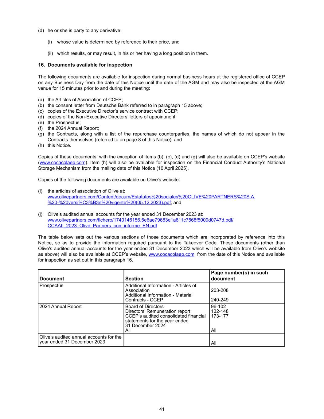 (d) he or she is party to any derivative: (i) whose value is determined by reference to their price, and (ii) which results, or may result, in his or her having a long position in them. 16. Documents available for inspection The following documents are available for inspection during normal business hours at the registered office of CCEP on any Business Day from the date of this Notice until the date of the AGM and may also be inspected at the AGM venue for 15 minutes prior to and during the meeting: (a) the Articles of Association of CCEP; (b) the consent letter from Deutsche Bank referred to in paragraph 15 above; (c) copies of the Executive Director’s service contract with CCEP; (d) copies of the Non-Executive Directors’ letters of appointment; (e) the Prospectus; (f) the 2024 Annual Report; (g) the Contracts, along with a list of the repurchase counterparties, the names of which do not appear in the Contracts themselves (referred to on page 8 of this Notice); and (h) this Notice. Copies of these documents, with the exception of items (b), (c), (d) and (g) will also be available on CCEP's website (www.cocacolaep.com). Item (h) will also be available for inspection on the Financial Conduct Authority’s National Storage Mechanism from the mailing date of this Notice (10 April 2025). Copies of the following documents are available on Olive’s website: (i) the articles of association of Olive at: www.olivepartners.com/Content/docum/Estatutos%20sociales%20OLIVE%20PARTNERS%20S.A. %20-%20versi%C3%B3n%20vigente%20(05.12.2023).pdf; and (j) Olive’s audited annual accounts for the year ended 31 December 2023 at: www.olivepartners.com/fichero/1740146156.5e6ae79683e1a811c7568f5009d0747d.pdf/ CCAAII_2023_Olive_Partners_con_informe_EN.pdf The table below sets out the various sections of those documents which are incorporated by reference into this Notice, so as to provide the information required pursuant to the Takeover Code. These documents (other than Olive's audited annual accounts for the year ended 31 December 2023 which will be available from Olive's website as above) will also be available at CCEP’s website, www.cocacolaep.com, from the date of this Notice and available for inspection as set out in this paragraph 16. Document Section Page number(s) in such document Prospectus Additional Information - Articles of Association Additional Information - Material Contracts - CCEP 203-208 240-249 2024 Annual Report Board of Directors Directors’ Remuneration report CCEP’s audited consolidated financial statements for the year ended 31 December 2024 All 96-102 132-148 173-177 All Olive’s audited annual accounts for the year ended 31 December 2023 All 41