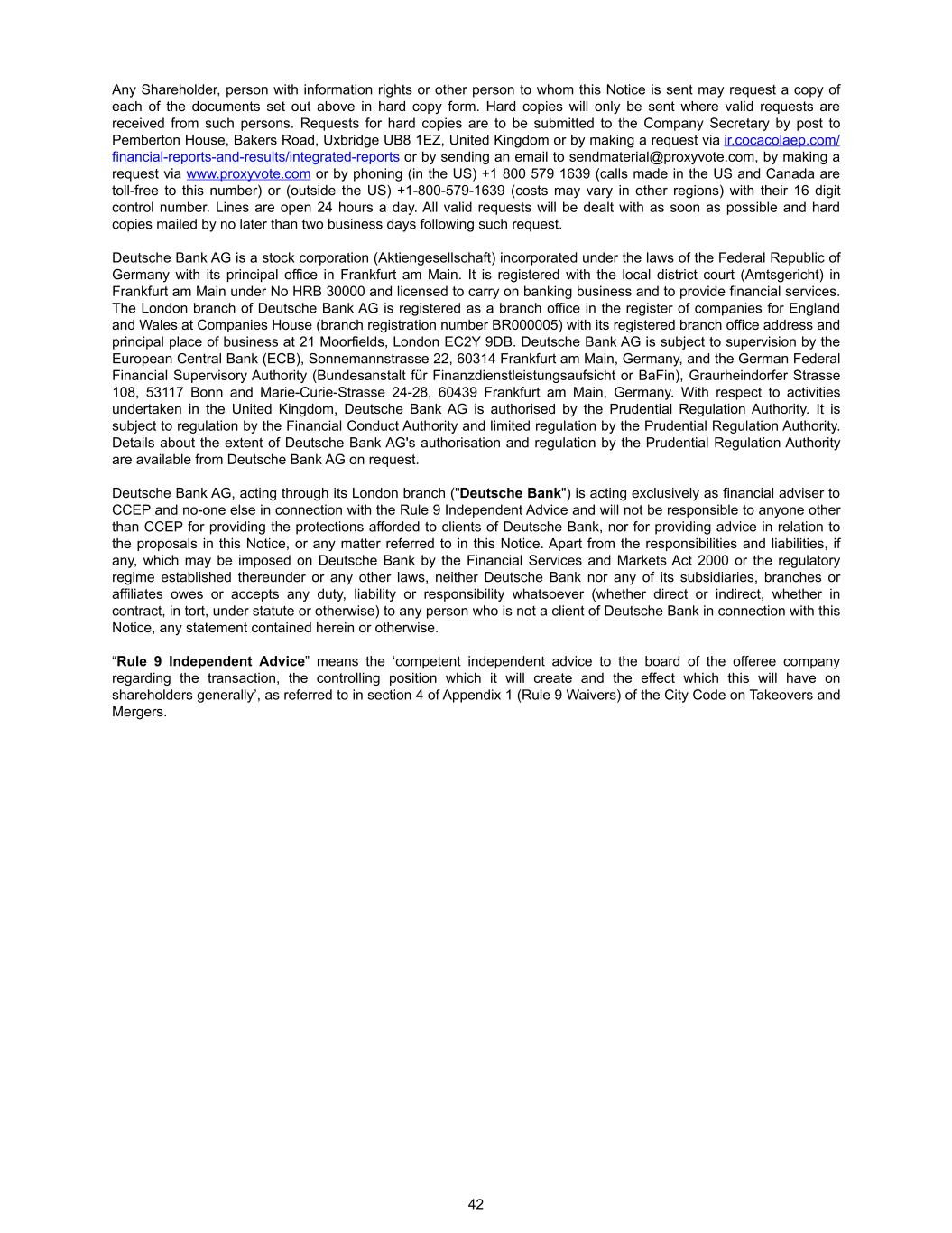 Any Shareholder, person with information rights or other person to whom this Notice is sent may request a copy of each of the documents set out above in hard copy form. Hard copies will only be sent where valid requests are received from such persons. Requests for hard copies are to be submitted to the Company Secretary by post to Pemberton House, Bakers Road, Uxbridge UB8 1EZ, United Kingdom or by making a request via ir.cocacolaep.com/ financial-reports-and-results/integrated-reports or by sending an email to sendmaterial@proxyvote.com, by making a request via www.proxyvote.com or by phoning (in the US) +1 800 579 1639 (calls made in the US and Canada are toll-free to this number) or (outside the US) +1-800-579-1639 (costs may vary in other regions) with their 16 digit control number. Lines are open 24 hours a day. All valid requests will be dealt with as soon as possible and hard copies mailed by no later than two business days following such request. Deutsche Bank AG is a stock corporation (Aktiengesellschaft) incorporated under the laws of the Federal Republic of Germany with its principal office in Frankfurt am Main. It is registered with the local district court (Amtsgericht) in Frankfurt am Main under No HRB 30000 and licensed to carry on banking business and to provide financial services. The London branch of Deutsche Bank AG is registered as a branch office in the register of companies for England and Wales at Companies House (branch registration number BR000005) with its registered branch office address and principal place of business at 21 Moorfields, London EC2Y 9DB. Deutsche Bank AG is subject to supervision by the European Central Bank (ECB), Sonnemannstrasse 22, 60314 Frankfurt am Main, Germany, and the German Federal Financial Supervisory Authority (Bundesanstalt für Finanzdienstleistungsaufsicht or BaFin), Graurheindorfer Strasse 108, 53117 Bonn and Marie-Curie-Strasse 24-28, 60439 Frankfurt am Main, Germany. With respect to activities undertaken in the United Kingdom, Deutsche Bank AG is authorised by the Prudential Regulation Authority. It is subject to regulation by the Financial Conduct Authority and limited regulation by the Prudential Regulation Authority. Details about the extent of Deutsche Bank AG's authorisation and regulation by the Prudential Regulation Authority are available from Deutsche Bank AG on request. Deutsche Bank AG, acting through its London branch ("Deutsche Bank") is acting exclusively as financial adviser to CCEP and no-one else in connection with the Rule 9 Independent Advice and will not be responsible to anyone other than CCEP for providing the protections afforded to clients of Deutsche Bank, nor for providing advice in relation to the proposals in this Notice, or any matter referred to in this Notice. Apart from the responsibilities and liabilities, if any, which may be imposed on Deutsche Bank by the Financial Services and Markets Act 2000 or the regulatory regime established thereunder or any other laws, neither Deutsche Bank nor any of its subsidiaries, branches or affiliates owes or accepts any duty, liability or responsibility whatsoever (whether direct or indirect, whether in contract, in tort, under statute or otherwise) to any person who is not a client of Deutsche Bank in connection with this Notice, any statement contained herein or otherwise. “Rule 9 Independent Advice” means the ‘competent independent advice to the board of the offeree company regarding the transaction, the controlling position which it will create and the effect which this will have on shareholders generally’, as referred to in section 4 of Appendix 1 (Rule 9 Waivers) of the City Code on Takeovers and Mergers. 42