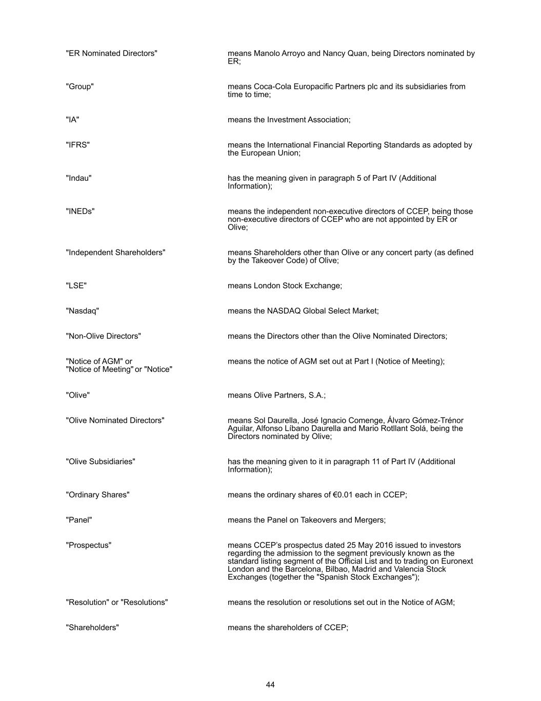 "ER Nominated Directors" means Manolo Arroyo and Nancy Quan, being Directors nominated by ER; "Group" means Coca-Cola Europacific Partners plc and its subsidiaries from time to time; "IA" means the Investment Association; "IFRS" means the International Financial Reporting Standards as adopted by the European Union; "Indau" has the meaning given in paragraph 5 of Part IV (Additional Information); "INEDs" means the independent non-executive directors of CCEP, being those non-executive directors of CCEP who are not appointed by ER or Olive; "Independent Shareholders" means Shareholders other than Olive or any concert party (as defined by the Takeover Code) of Olive; "LSE" means London Stock Exchange; "Nasdaq" means the NASDAQ Global Select Market; "Non-Olive Directors" means the Directors other than the Olive Nominated Directors; "Notice of AGM" or "Notice of Meeting" or "Notice" means the notice of AGM set out at Part I (Notice of Meeting); "Olive" means Olive Partners, S.A.; "Olive Nominated Directors" means Sol Daurella, José Ignacio Comenge, Álvaro Gómez-Trénor Aguilar, Alfonso Líbano Daurella and Mario Rotllant Solá, being the Directors nominated by Olive; "Olive Subsidiaries" has the meaning given to it in paragraph 11 of Part IV (Additional Information); "Ordinary Shares" means the ordinary shares of €0.01 each in CCEP; "Panel" means the Panel on Takeovers and Mergers; "Prospectus" means CCEP’s prospectus dated 25 May 2016 issued to investors regarding the admission to the segment previously known as the standard listing segment of the Official List and to trading on Euronext London and the Barcelona, Bilbao, Madrid and Valencia Stock Exchanges (together the "Spanish Stock Exchanges"); "Resolution" or "Resolutions" means the resolution or resolutions set out in the Notice of AGM; "Shareholders" means the shareholders of CCEP; 44