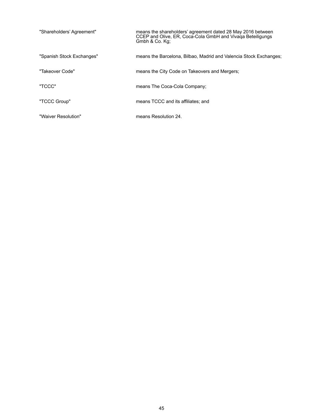 "Shareholders’ Agreement" means the shareholders’ agreement dated 28 May 2016 between CCEP and Olive, ER, Coca-Cola GmbH and Vivaqa Beteiligungs Gmbh & Co. Kg; "Spanish Stock Exchanges" means the Barcelona, Bilbao, Madrid and Valencia Stock Exchanges; "Takeover Code" means the City Code on Takeovers and Mergers; "TCCC" means The Coca-Cola Company; "TCCC Group" means TCCC and its affiliates; and "Waiver Resolution" means Resolution 24. 45